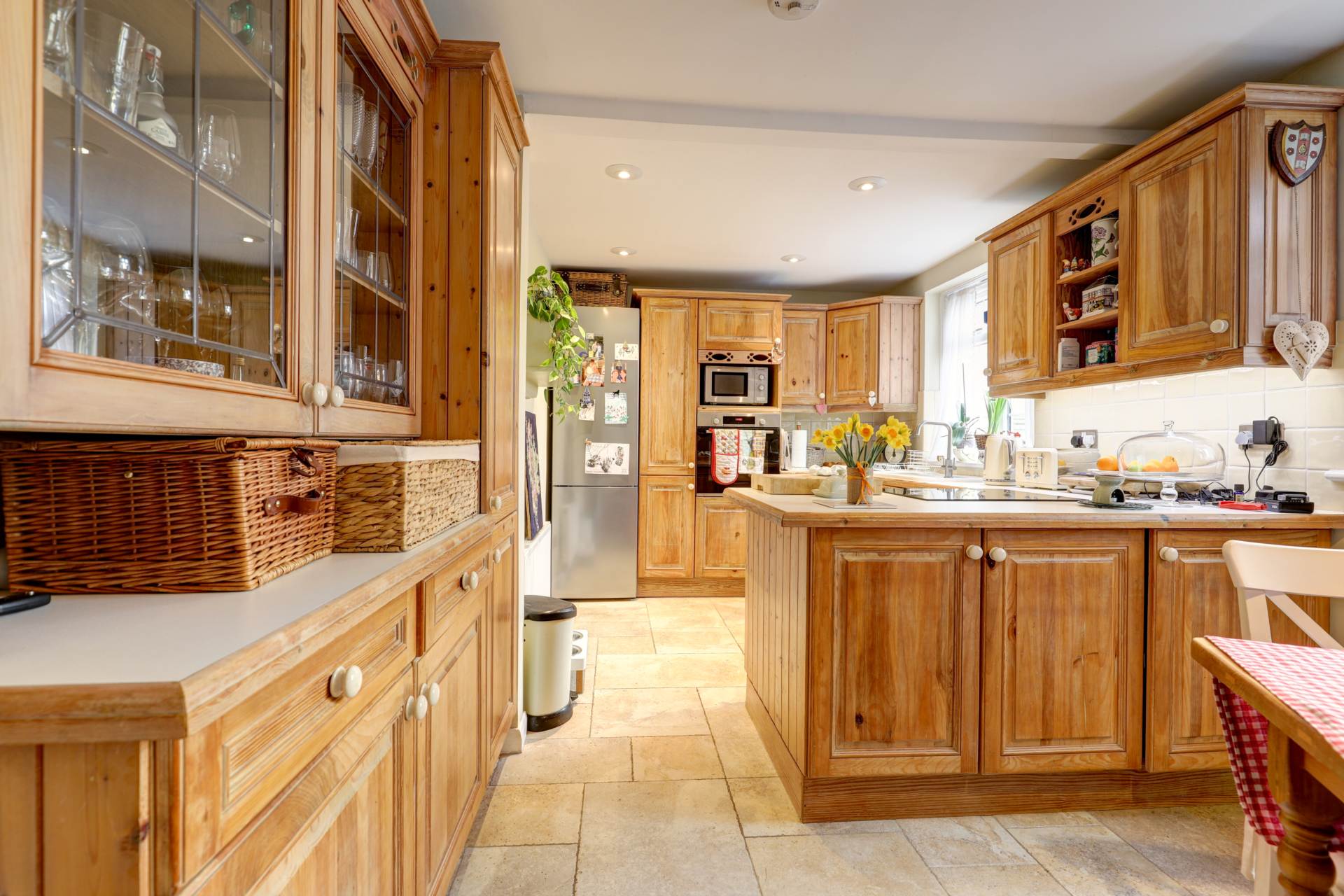 The kitchen/breakfast room is generously arranged and well-equipped with an extensive range of storage units and ample worktop space, complemented by integrated cooking appliances and room for further white goods. Dual rear-facing windows allow natural light to flood the room, creating a bright and practical everyday living space.
