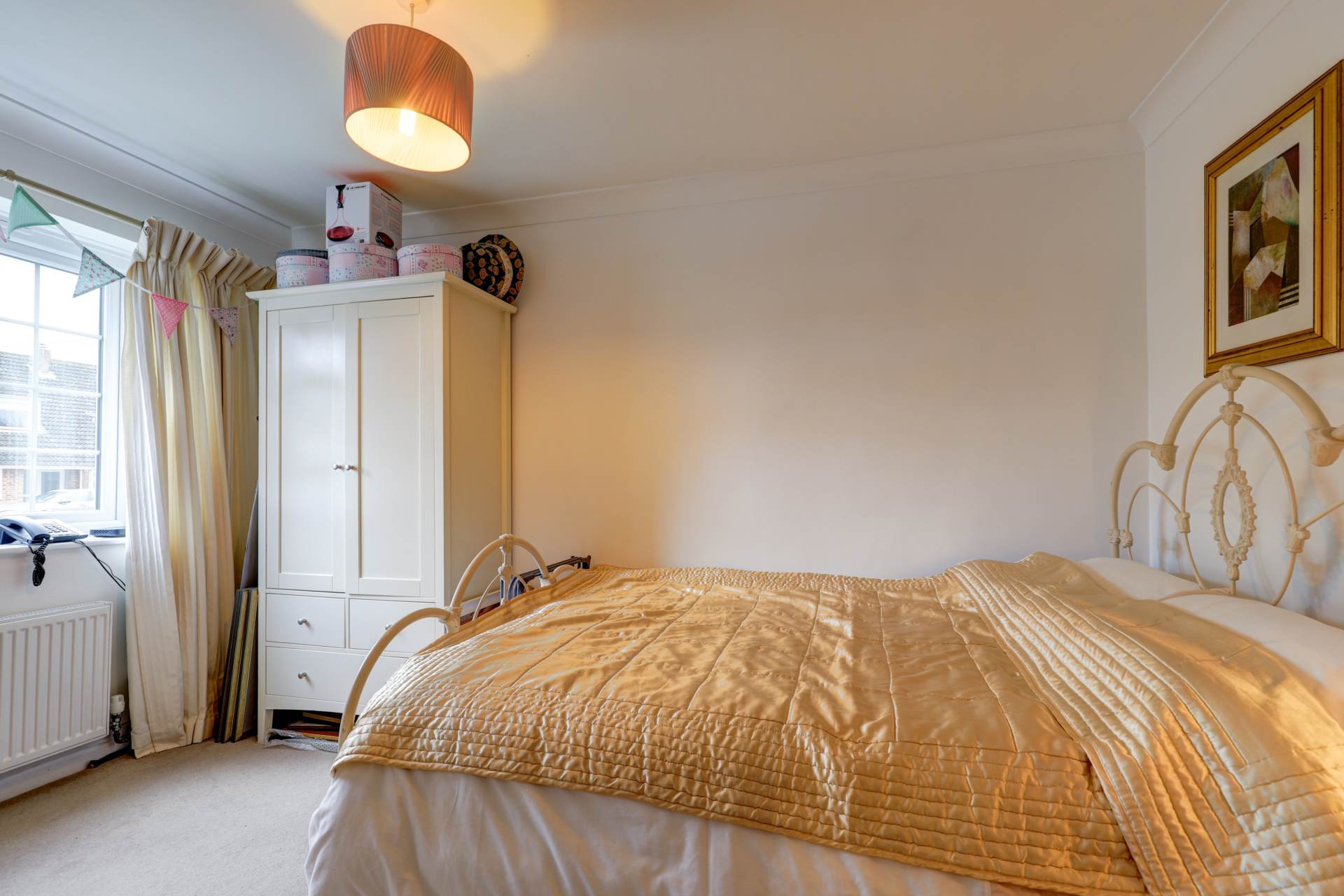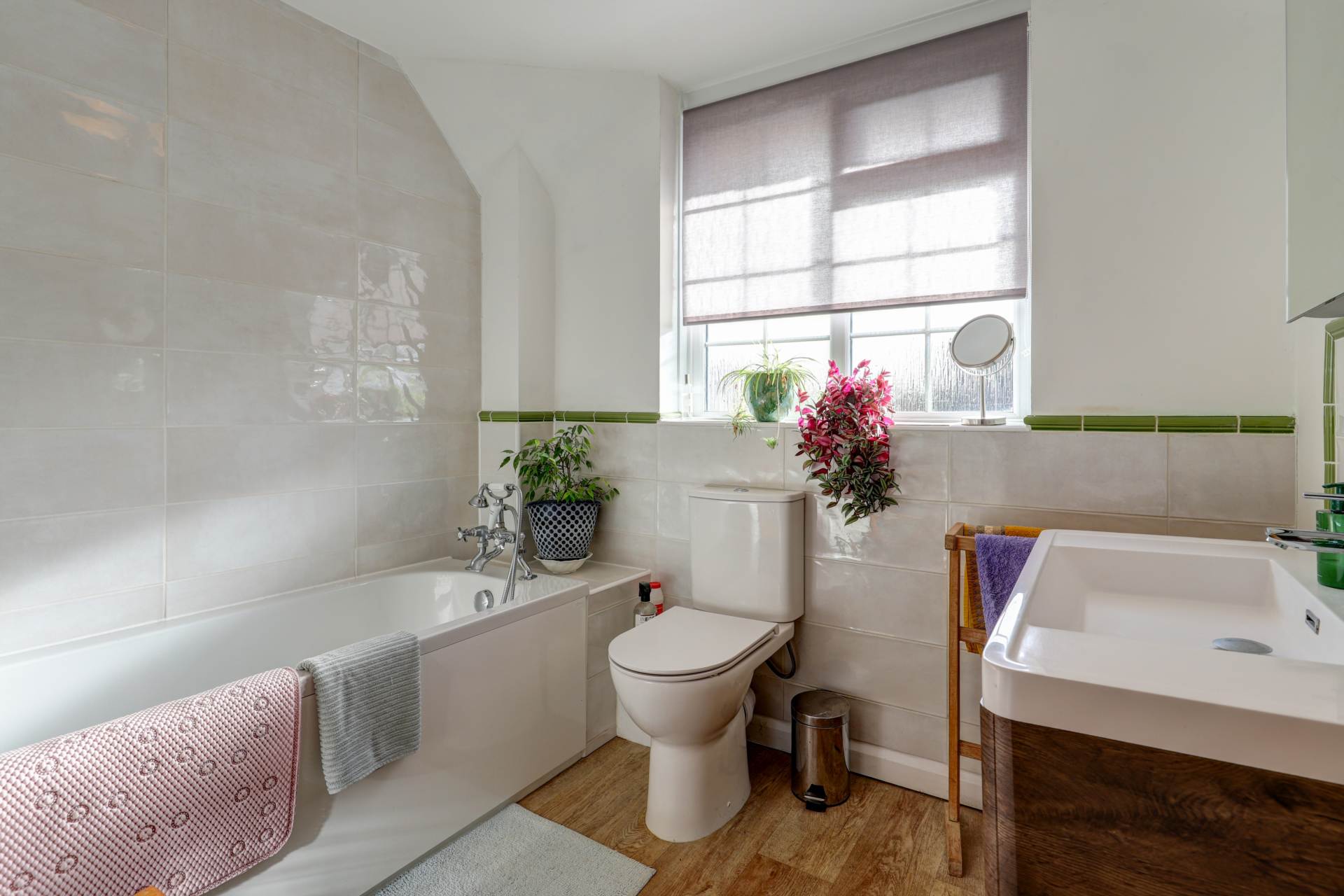 Upstairs, the first floor hosts two notably spacious double bedrooms. The principal bedroom overlooks the garden and benefits from substantial built-in storage, while the second bedroom enjoys attractive open views to the front. A stylishly refitted family bathroom serves this floor, finished in a classic white suite with quality fittings.