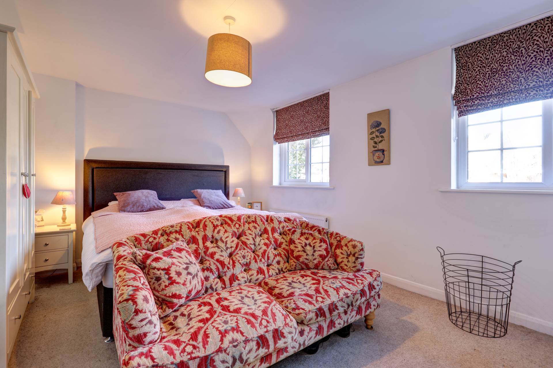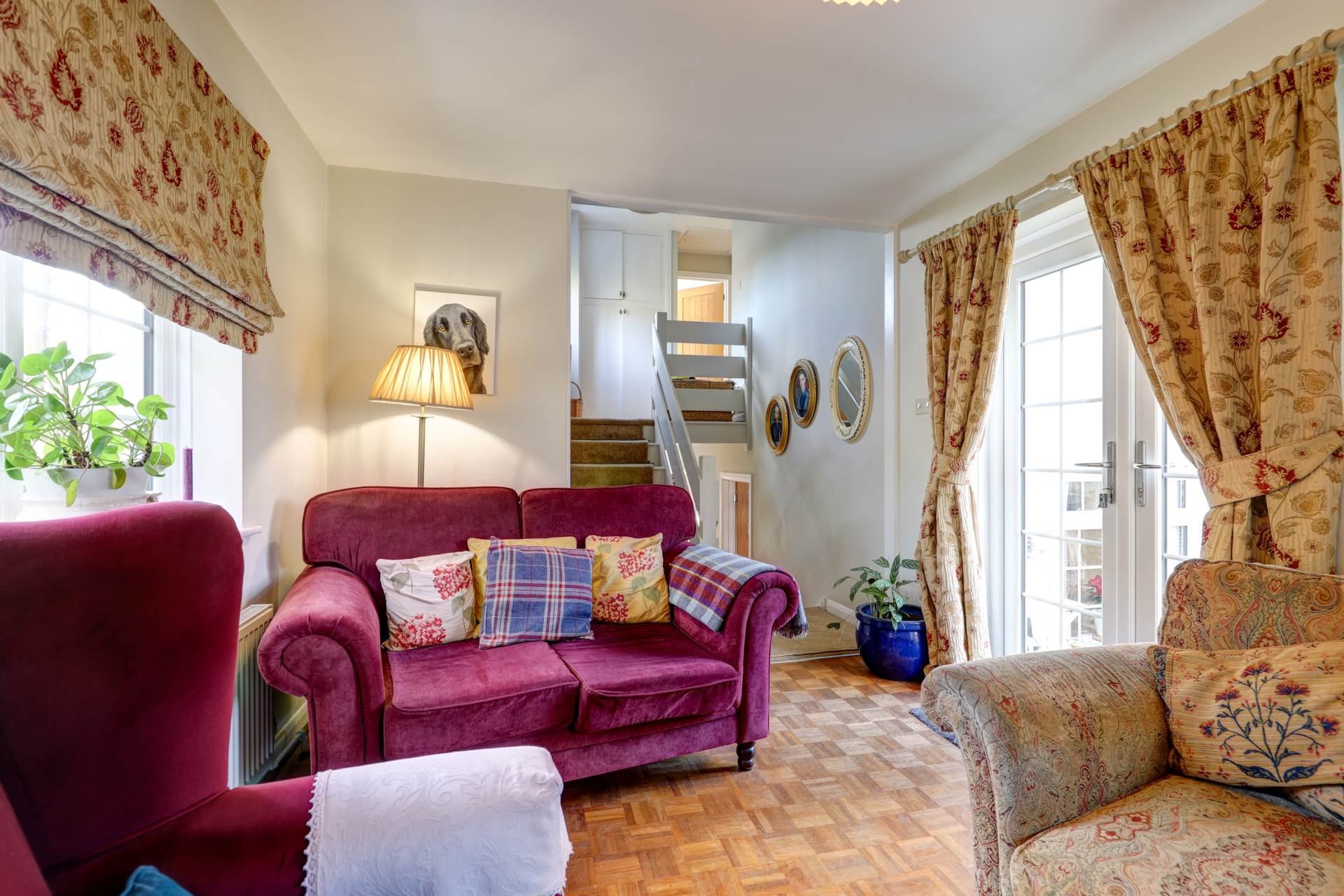 To the rear, the split-level sitting room enjoys a dual aspect and benefits from French doors opening directly onto the garden, offering an inviting setting for relaxation and entertaining.