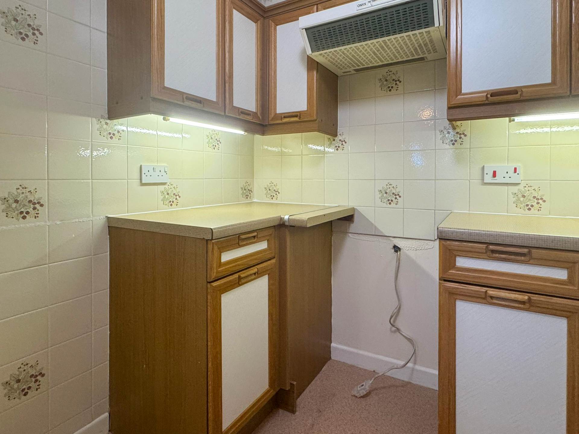 Kitchen - 2.2 x 1.6 (7`2" x 5`2") - A dated but well appointed kitchen with a selection of wall and floor units in a wood finish with stone effect work tops, stainless steel sink and spaces for a selection white goods