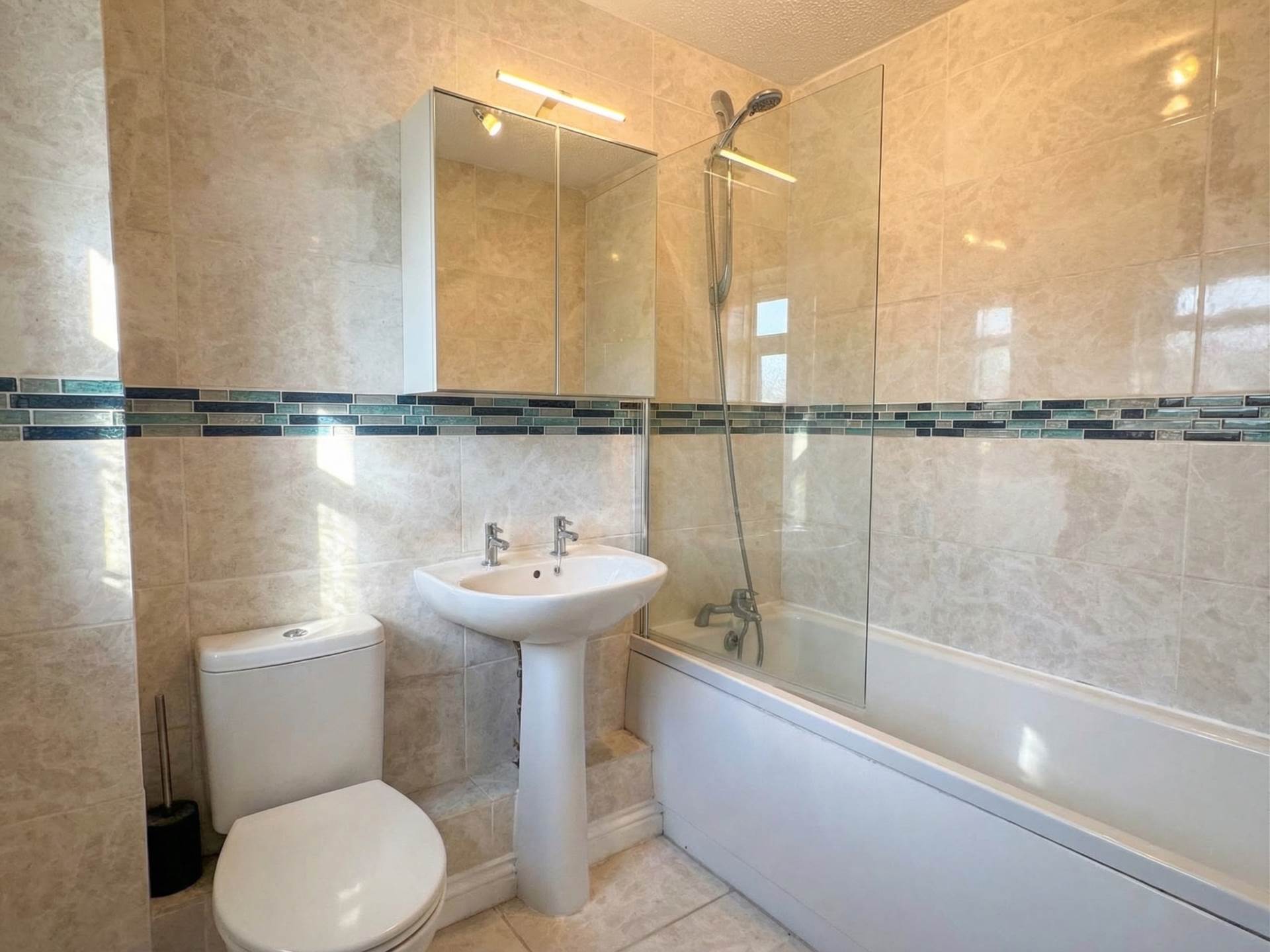 Modern fully tiled suite comprising panelled bath with glass screen and shower over, pedestal wash basin, WC and wall mirror cabinet.