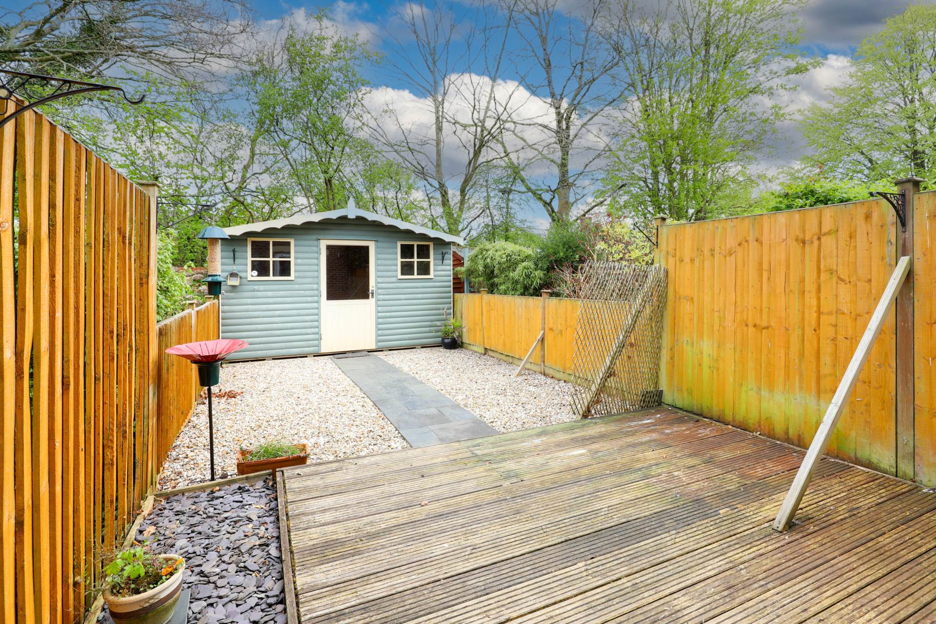Low-maintenance south-facing garden with decked seating area, gravelled section, fencing for privacy and a substantial timber outbuilding ideal as a workshop or hobby room.