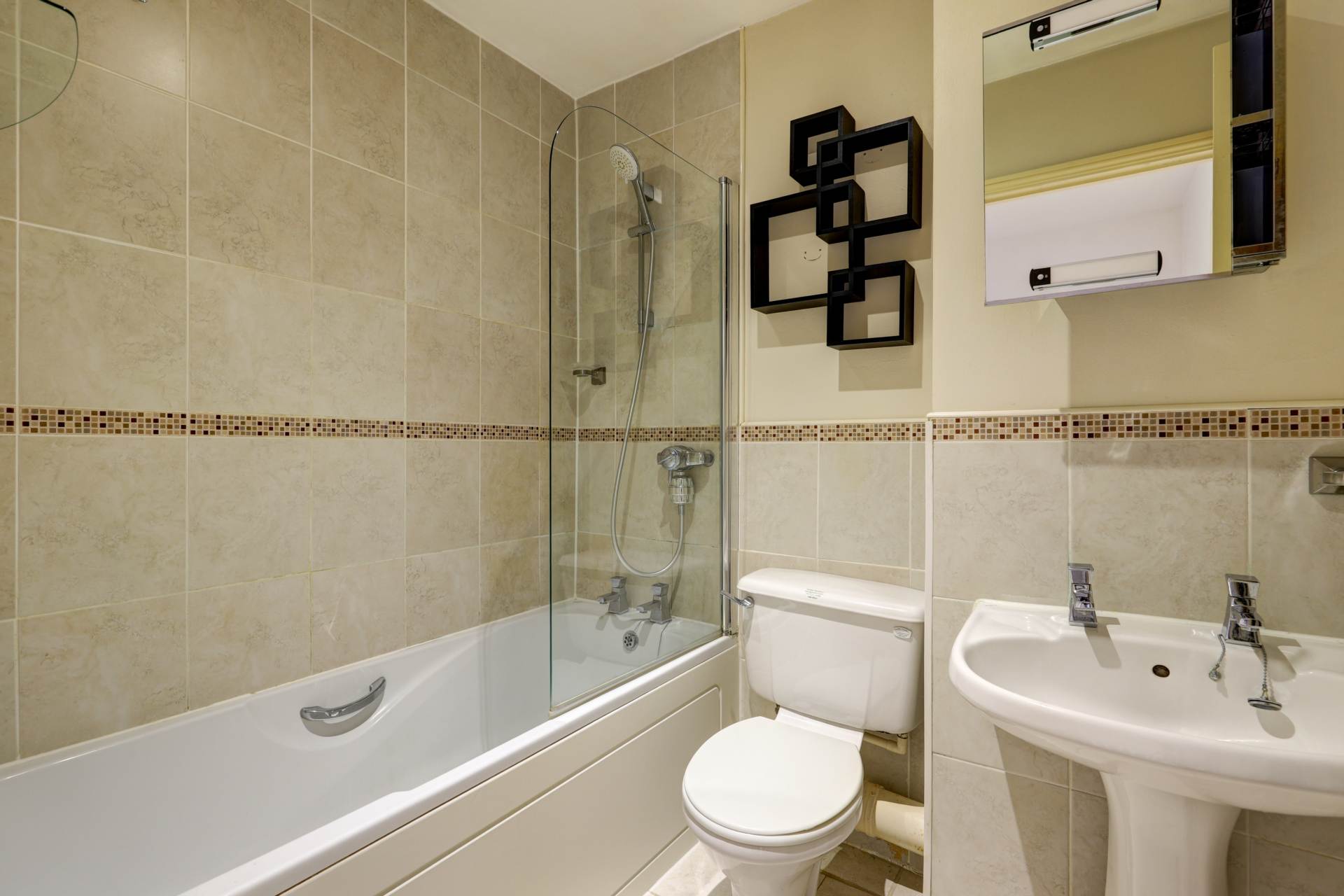 Modern family bathroom fitted with a panelled bath with glazed screen and shower over, wash basin, WC, fully tiled walls and contemporary fittings.