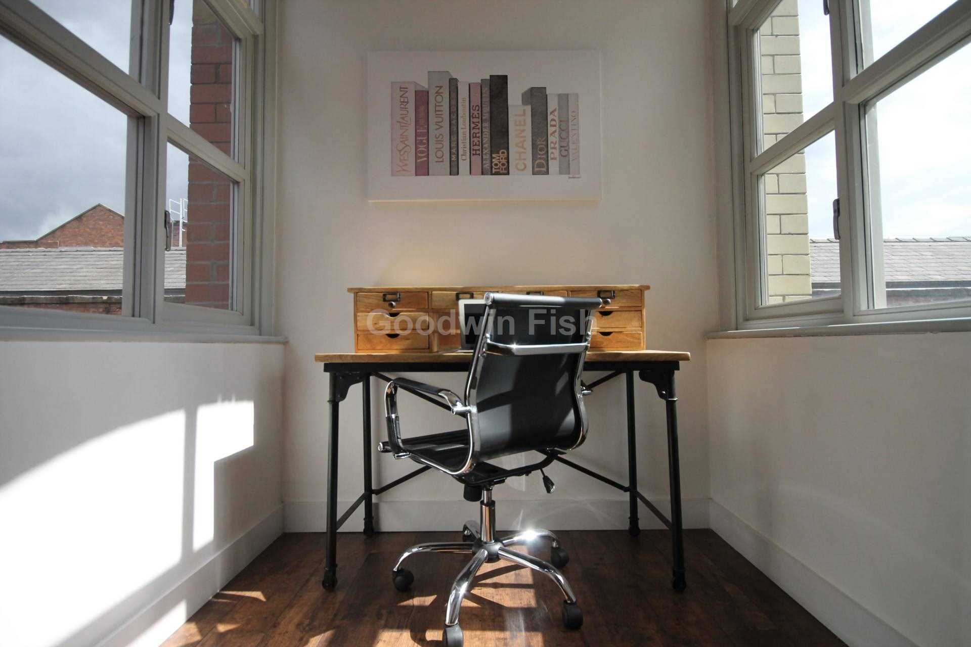 Study - 1.73m x 1.65m (5`8" x 5`5") - Accessed from the living room with two double glazed windows offering duel aspects across the Ancoats roof tops, with solid oak flooring and original tiled and exposed brick walls. A great additional space.
