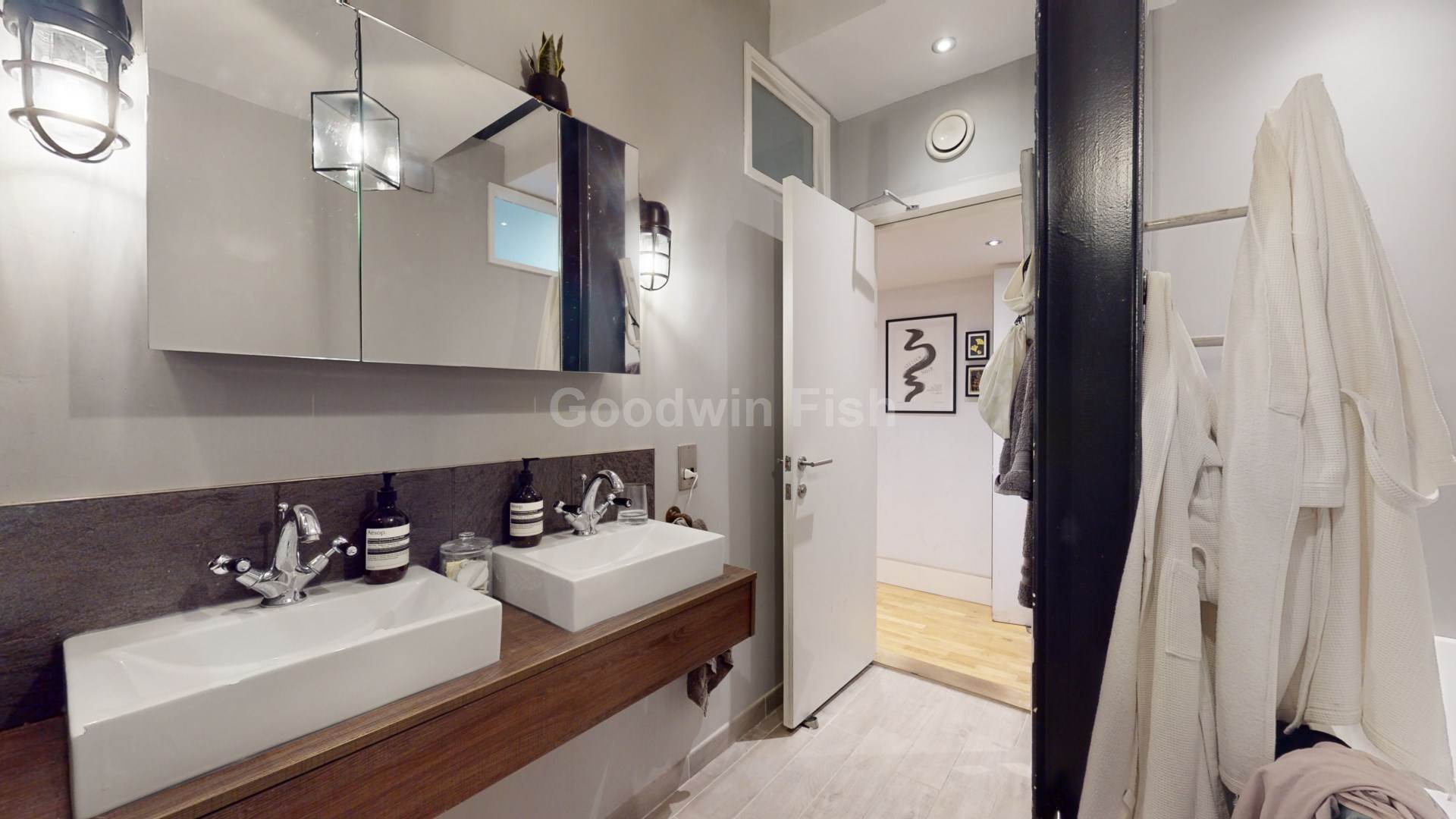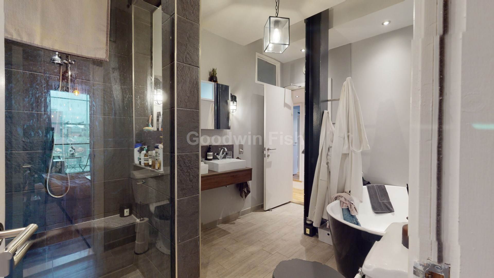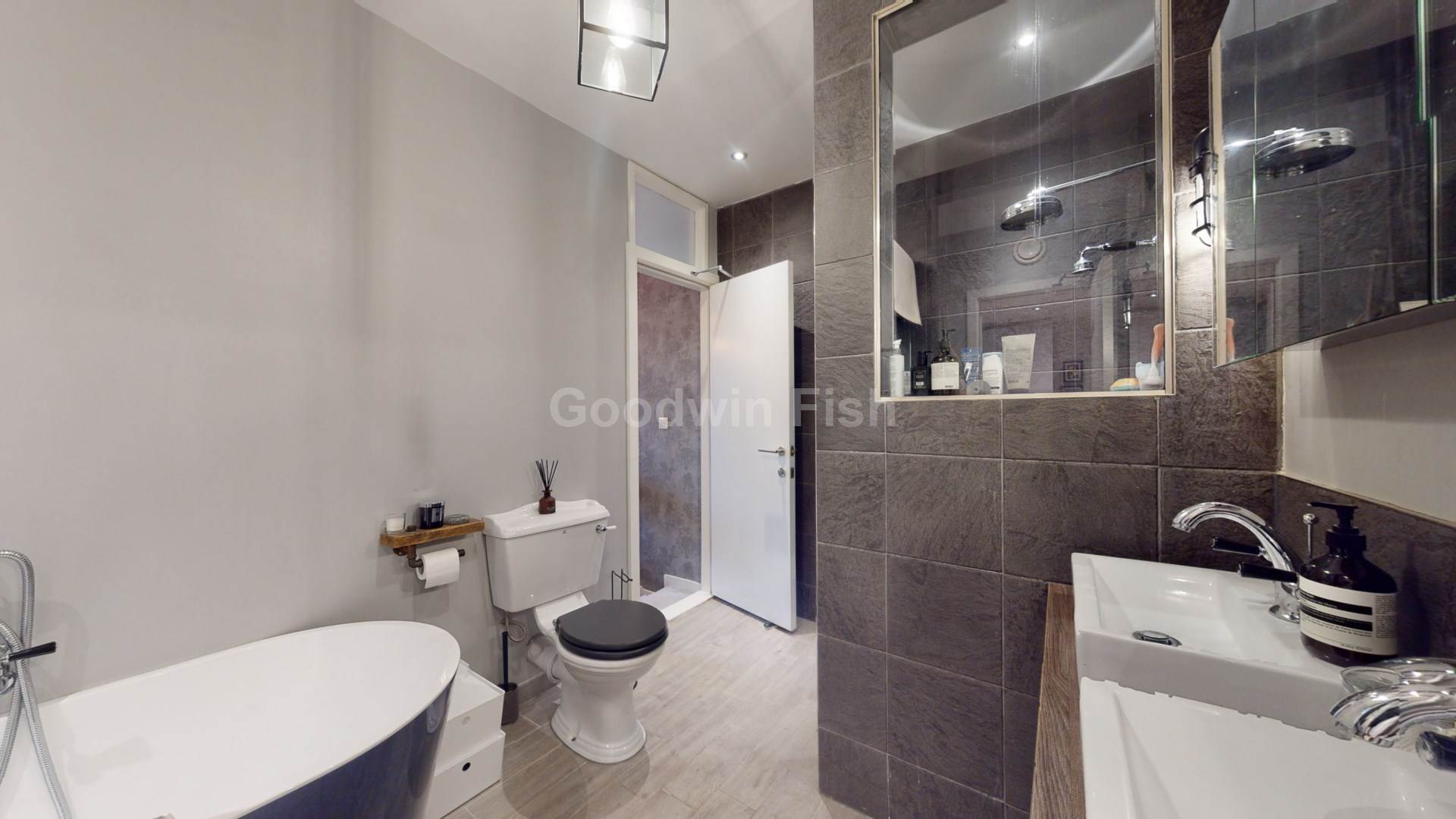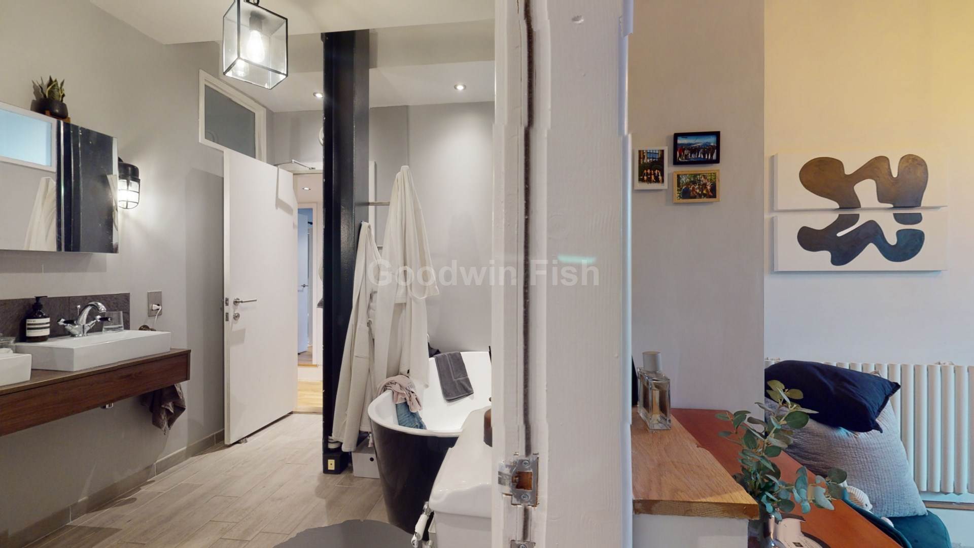 Property briefly comprises: entrance/hallway; primary bedroom with access to Jack and Jill bathroom with roll top bath, separate shower cubicle and twin sinks; dressing room; second double bedroom/study with access to additional en suite bathroom; open plan lounge/diner with access to balcony; kitchen with integrated appliances.