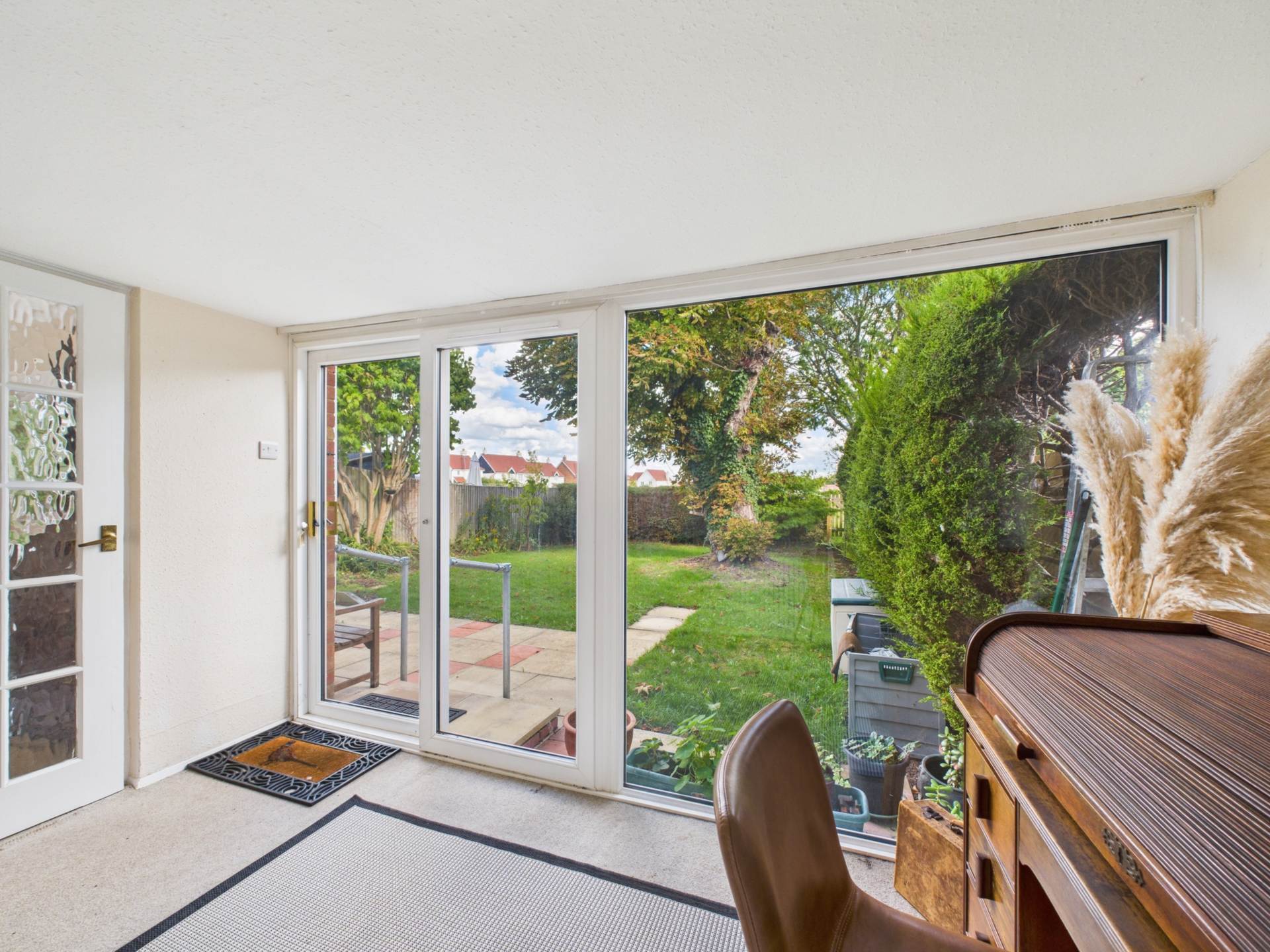 Inside, the welcoming hallway with cloakroom leads into a bright sitting room overlooking the garden, opening into a versatile study with French doors onto the patio. The well-equipped kitchen provides ample storage and flows into a generous dining area, enhanced by a striking full-height window and space for both a breakfast bar and dining table.
