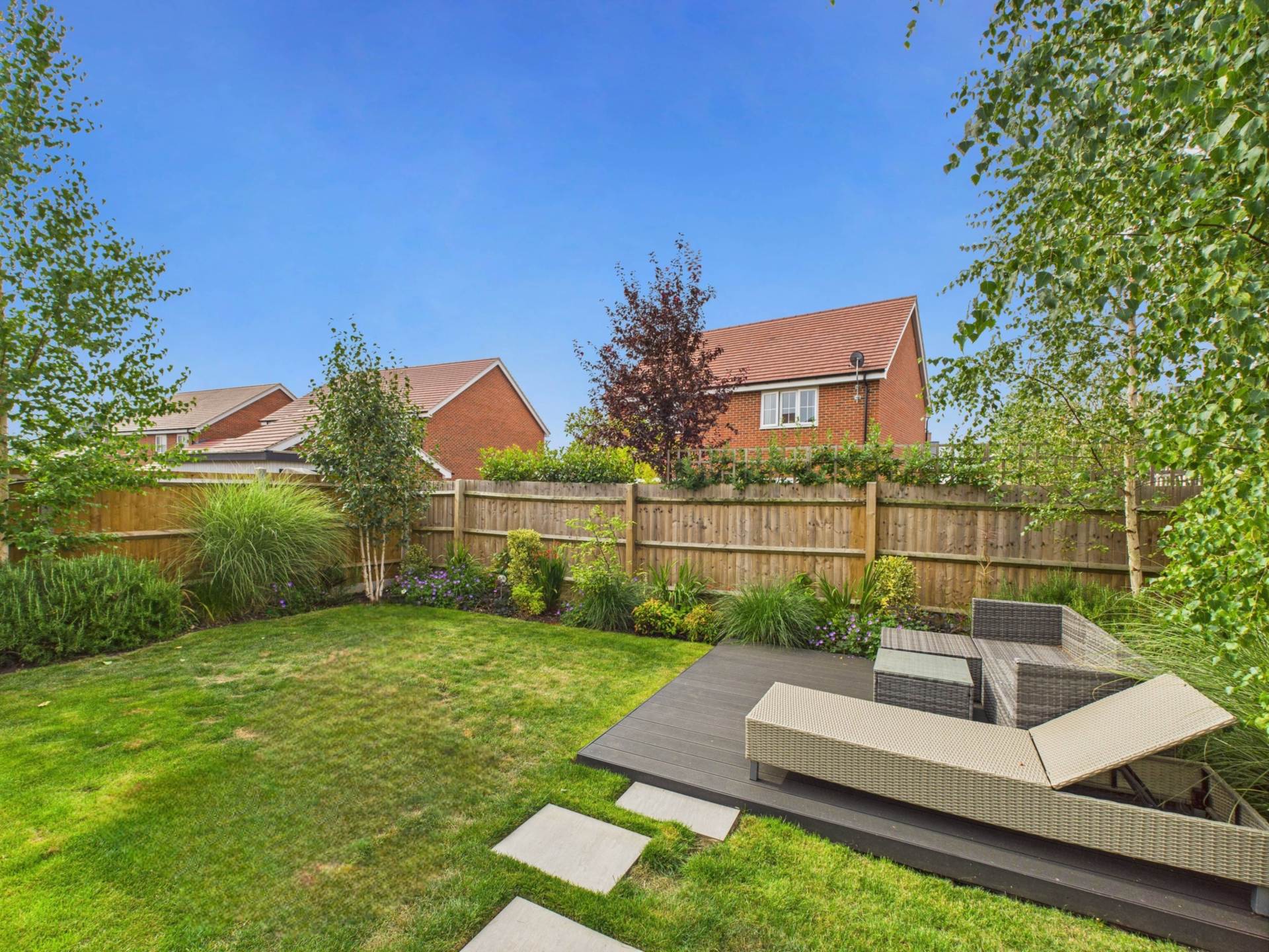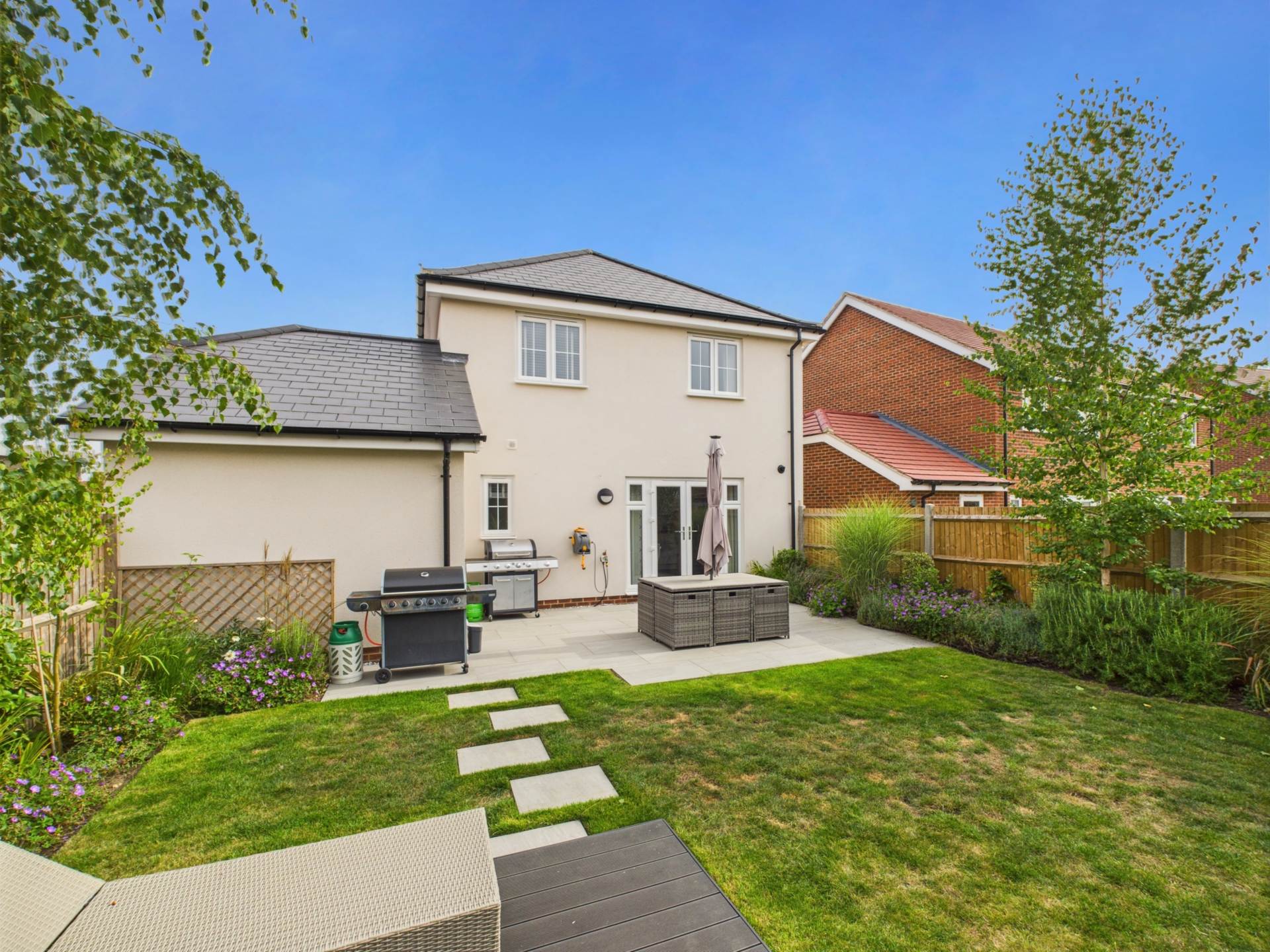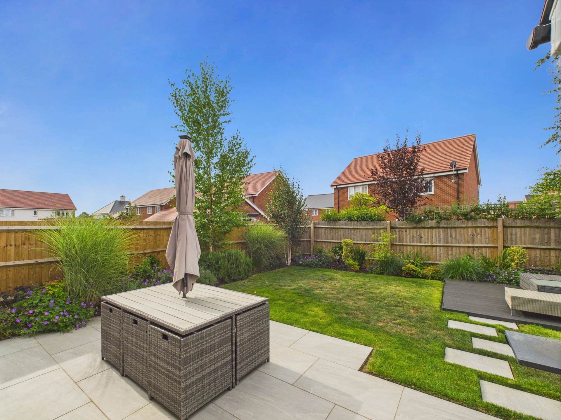 Externally, the landscaped rear garden is bordered by well-maintained plants and includes a separate raised suntrap seating area ideal for enjoying warm summer days. Additional benefits include a single garage, off-street parking, and a superb position overlooking the green and children`s play area, offering an open and scenic outlook.