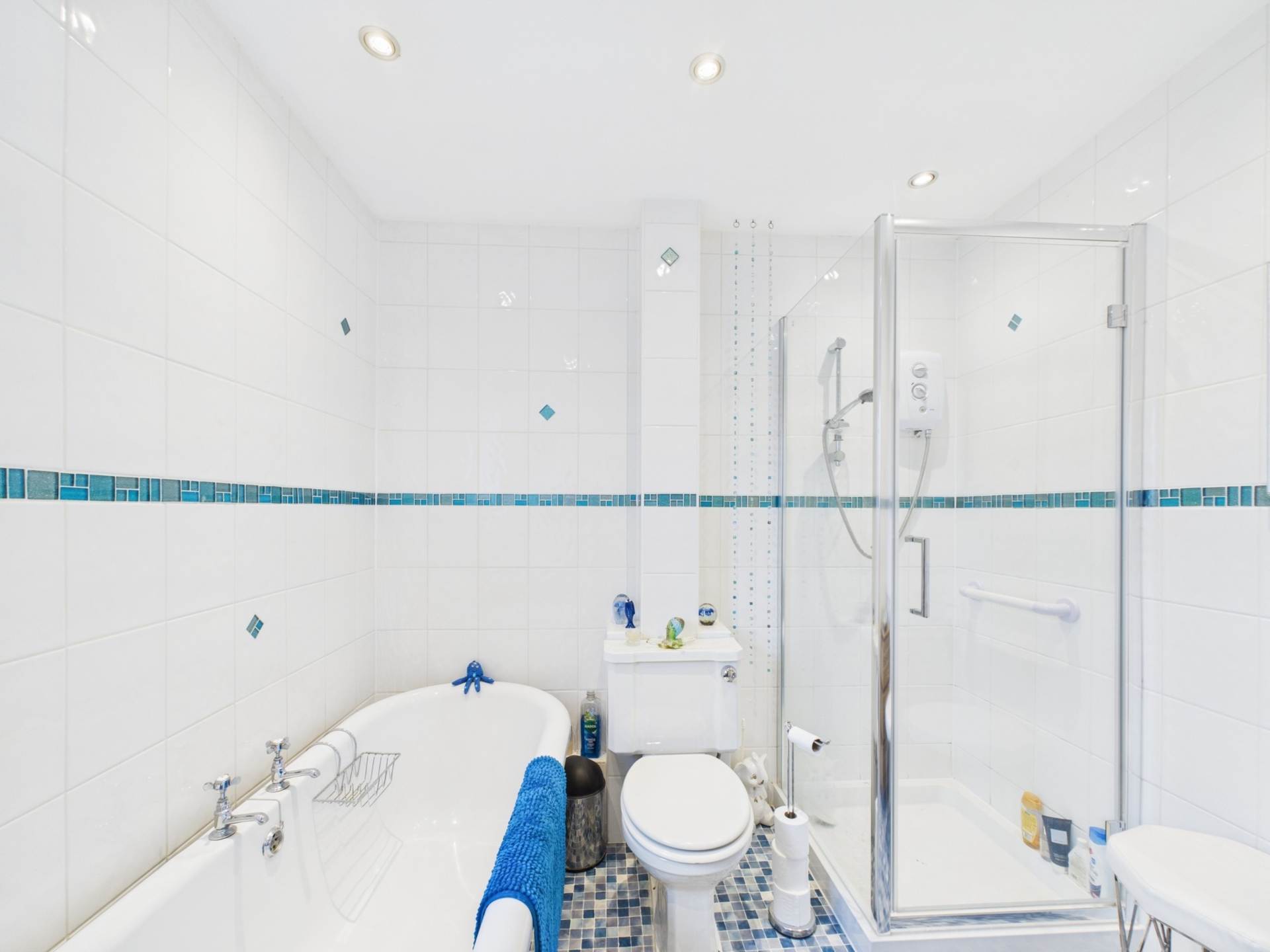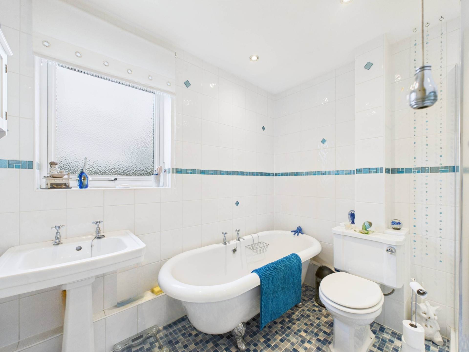 To the first floor are three well-proportioned bedrooms- two doubles and a good-sized single- along with a stylish family bathroom featuring a roll-top bath and separate shower.