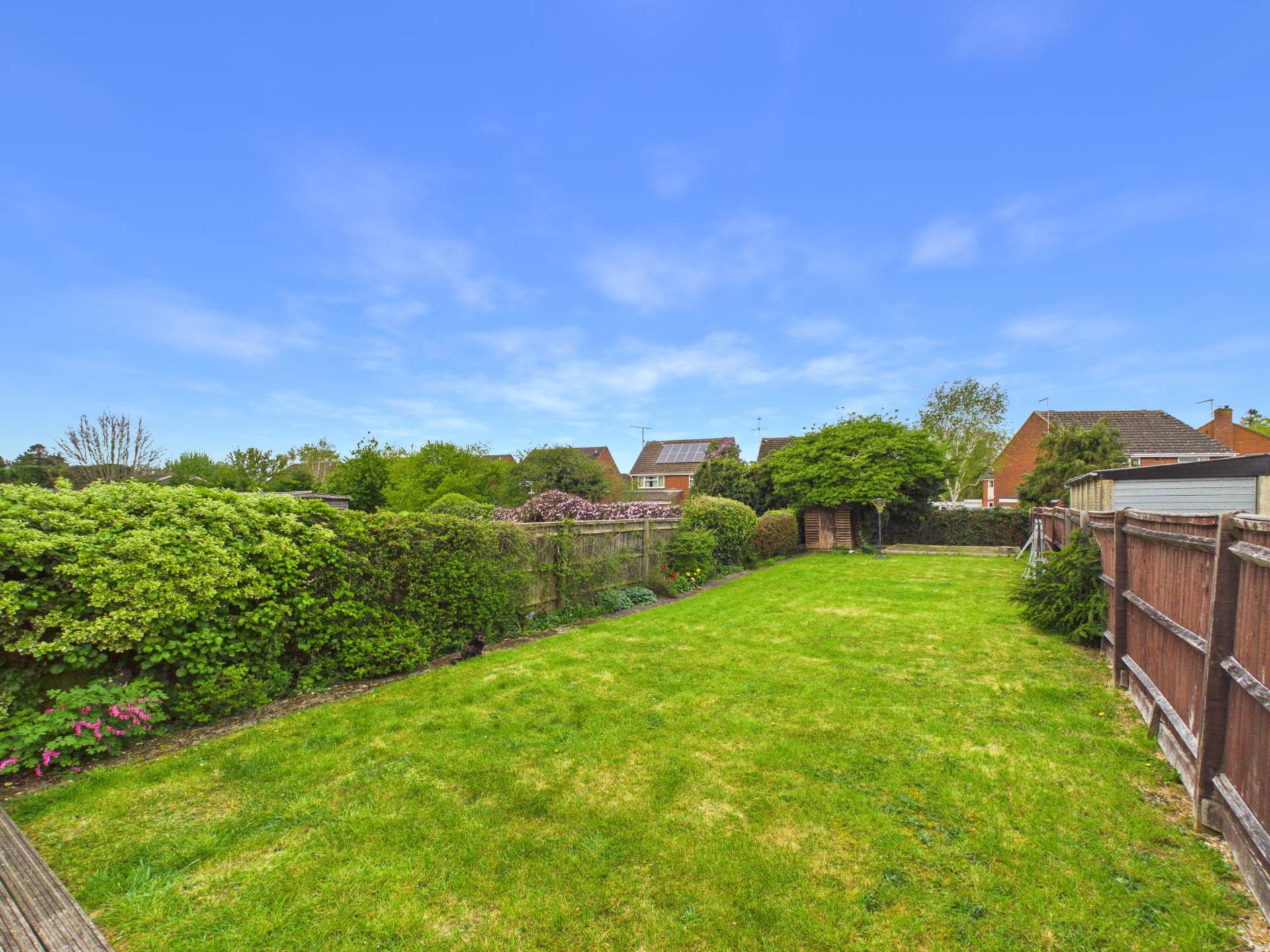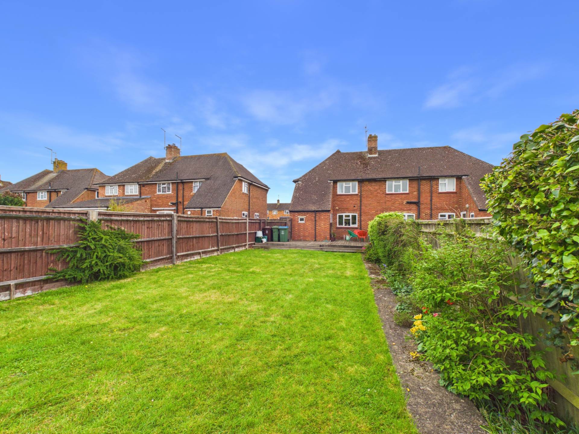 To the rear, a generously sized garden with a large decking area provides excellent space for relaxation, entertaining, or family activities.