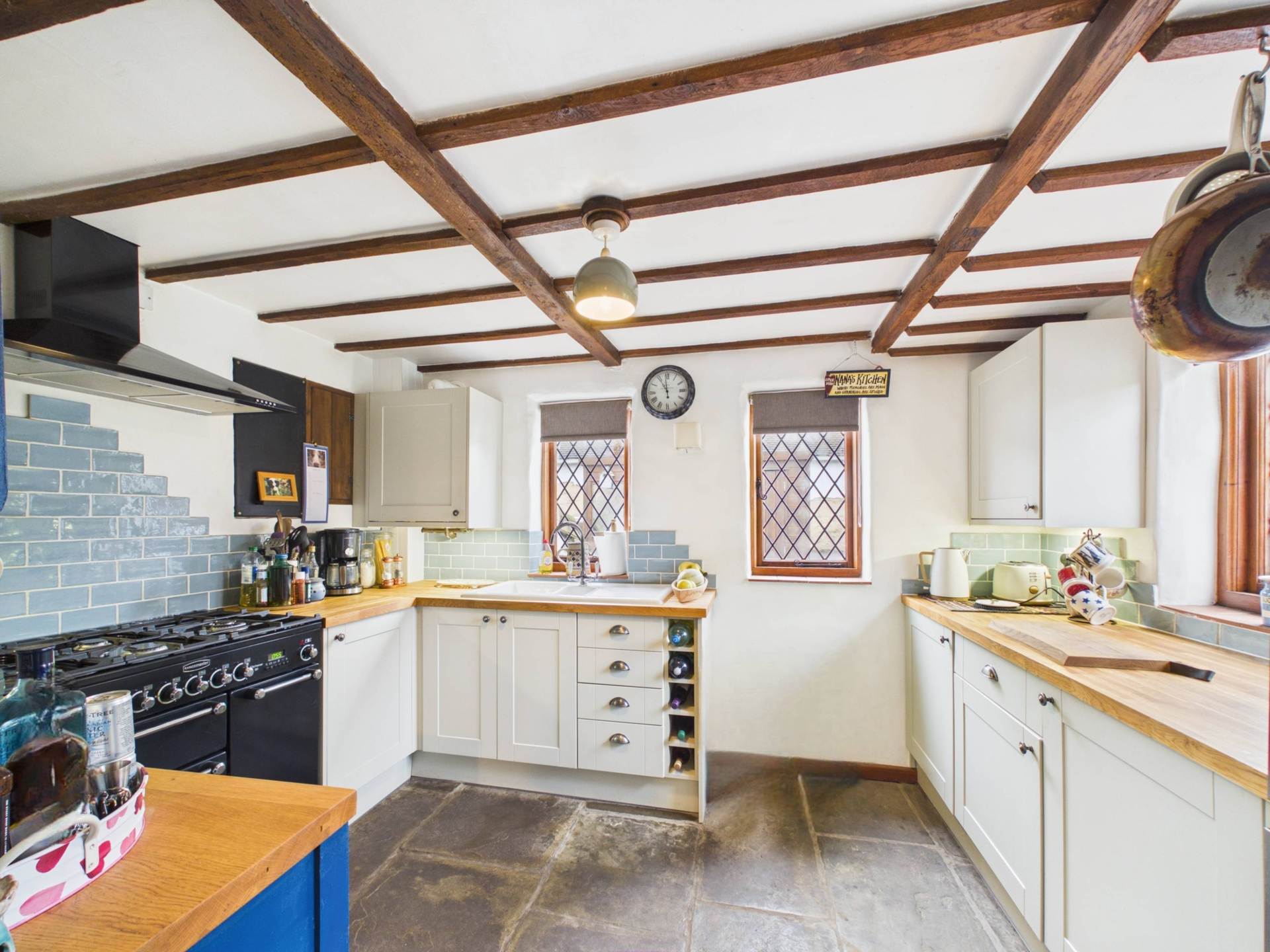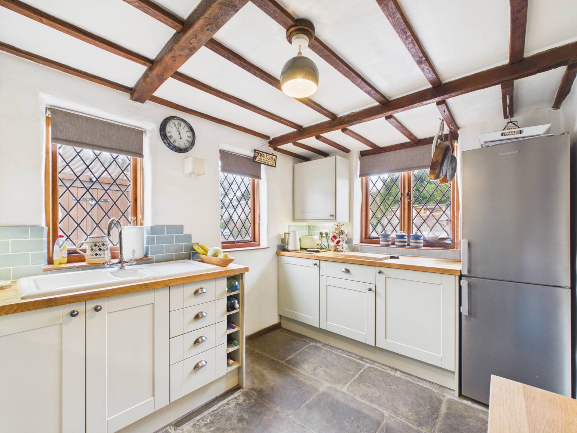 Original features such as a log burning stove , exposed beams and flagstone flooring are complemented by modern enhancements, including an en-suite to the principal bedroom and an enclosed walled courtyard to the side.