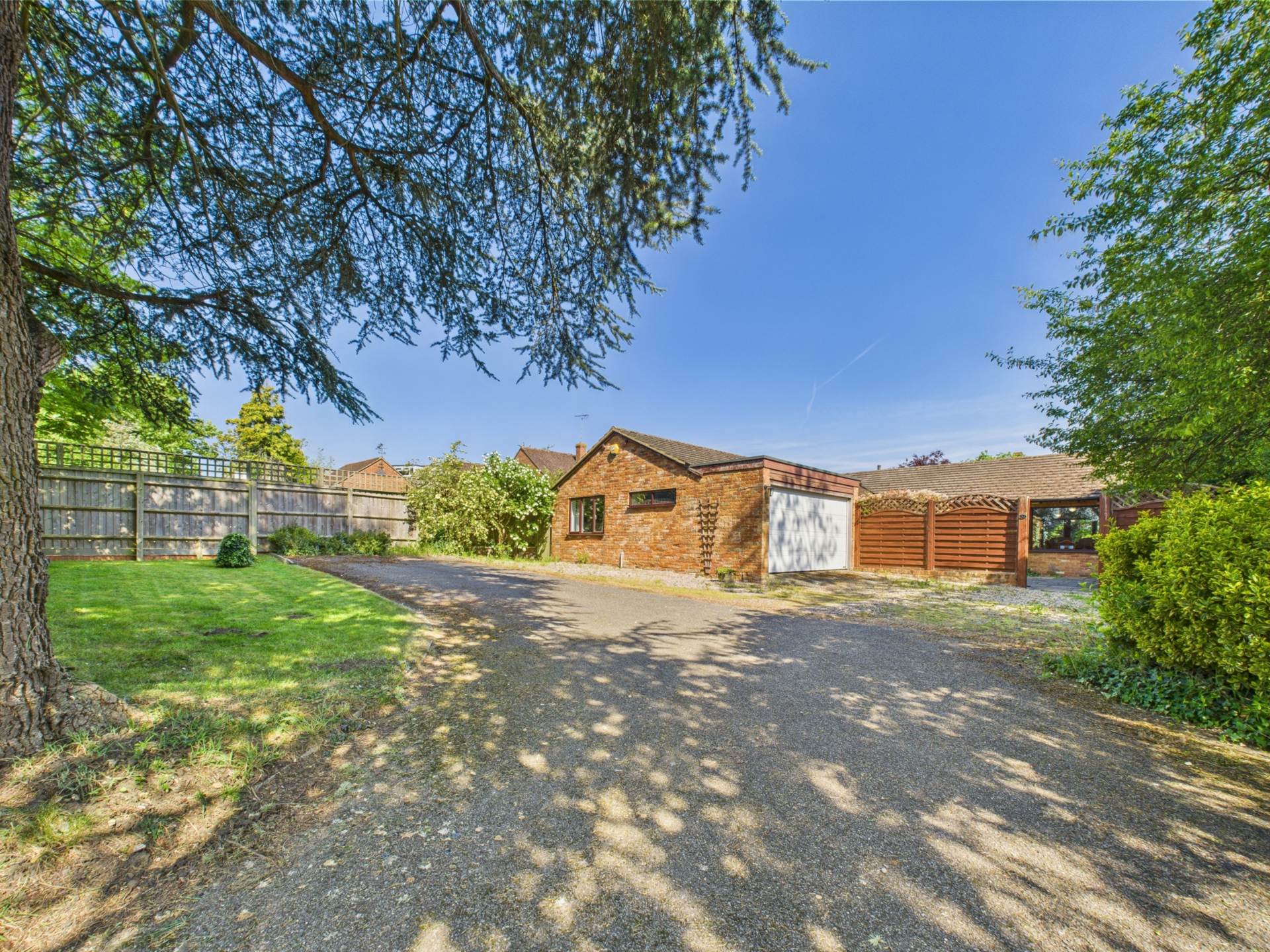 Externally, the bungalow boasts an attractive rear garden with a large patio area, lawn, and well-established trees and shrubs, creating a peaceful and private outdoor space. The front garden is equally generous, featuring a combination of lawn, gravelled and patio areas, along with a large driveway offering off-street parking for multiple vehicles and access to a garage.