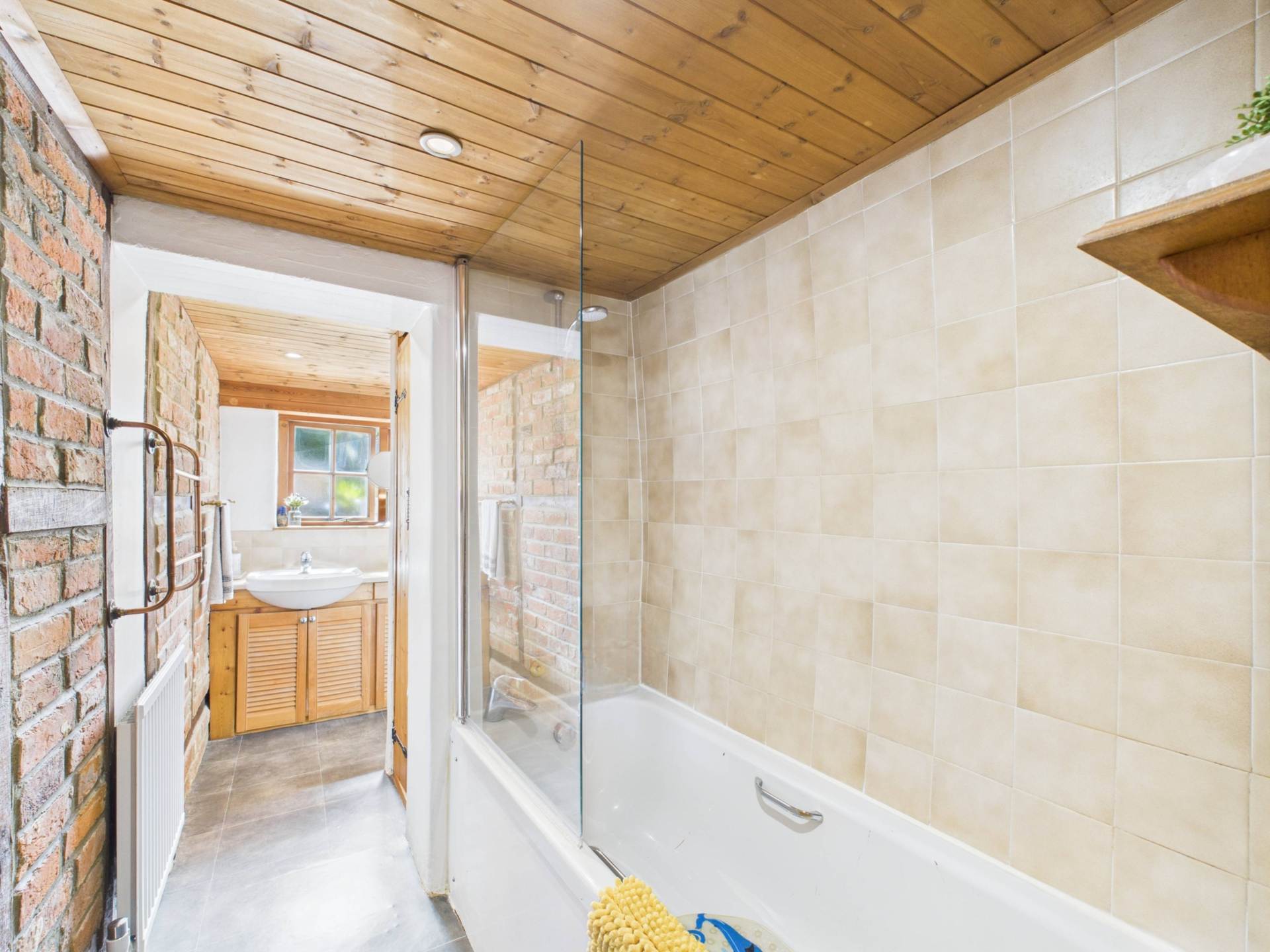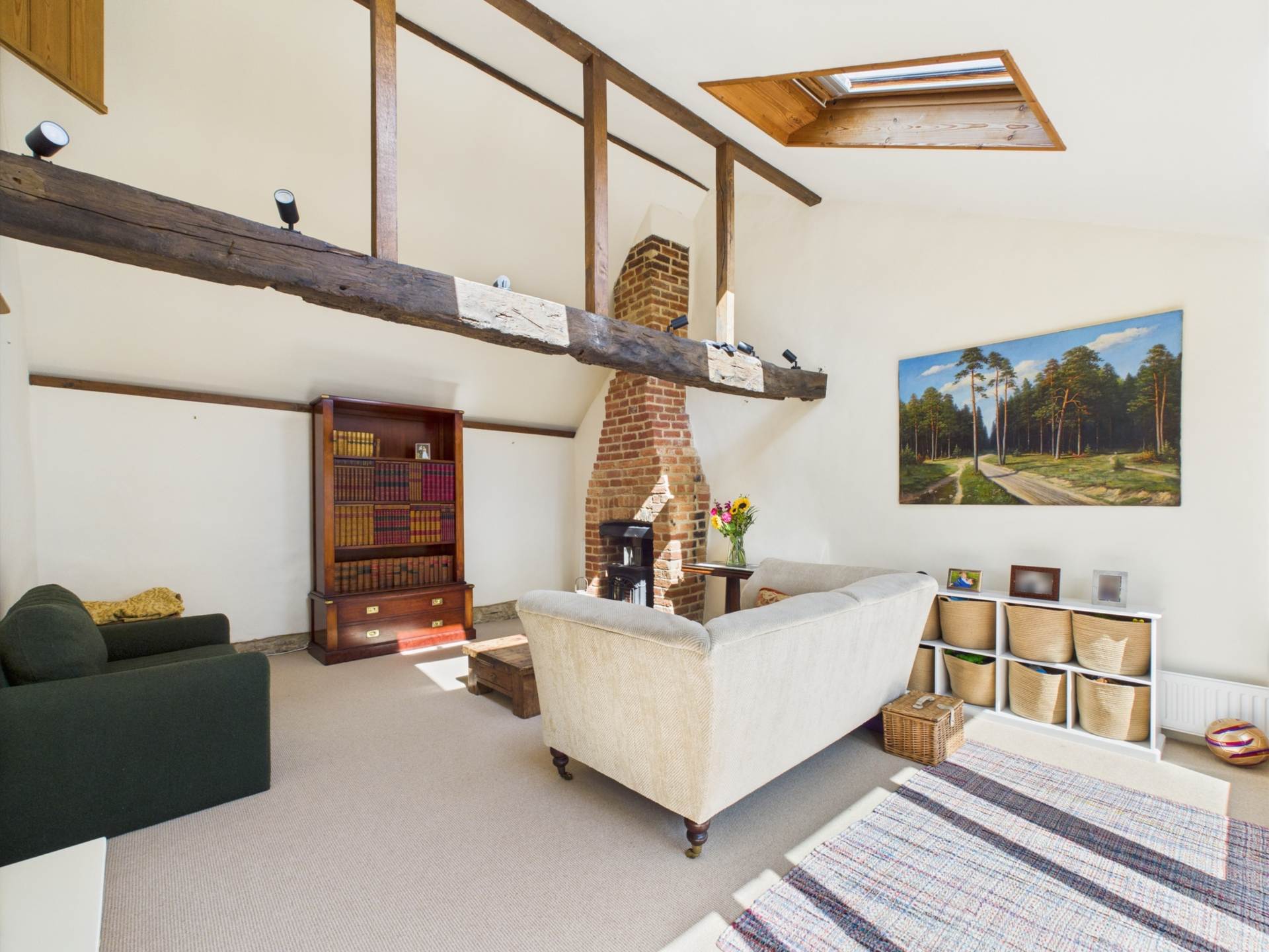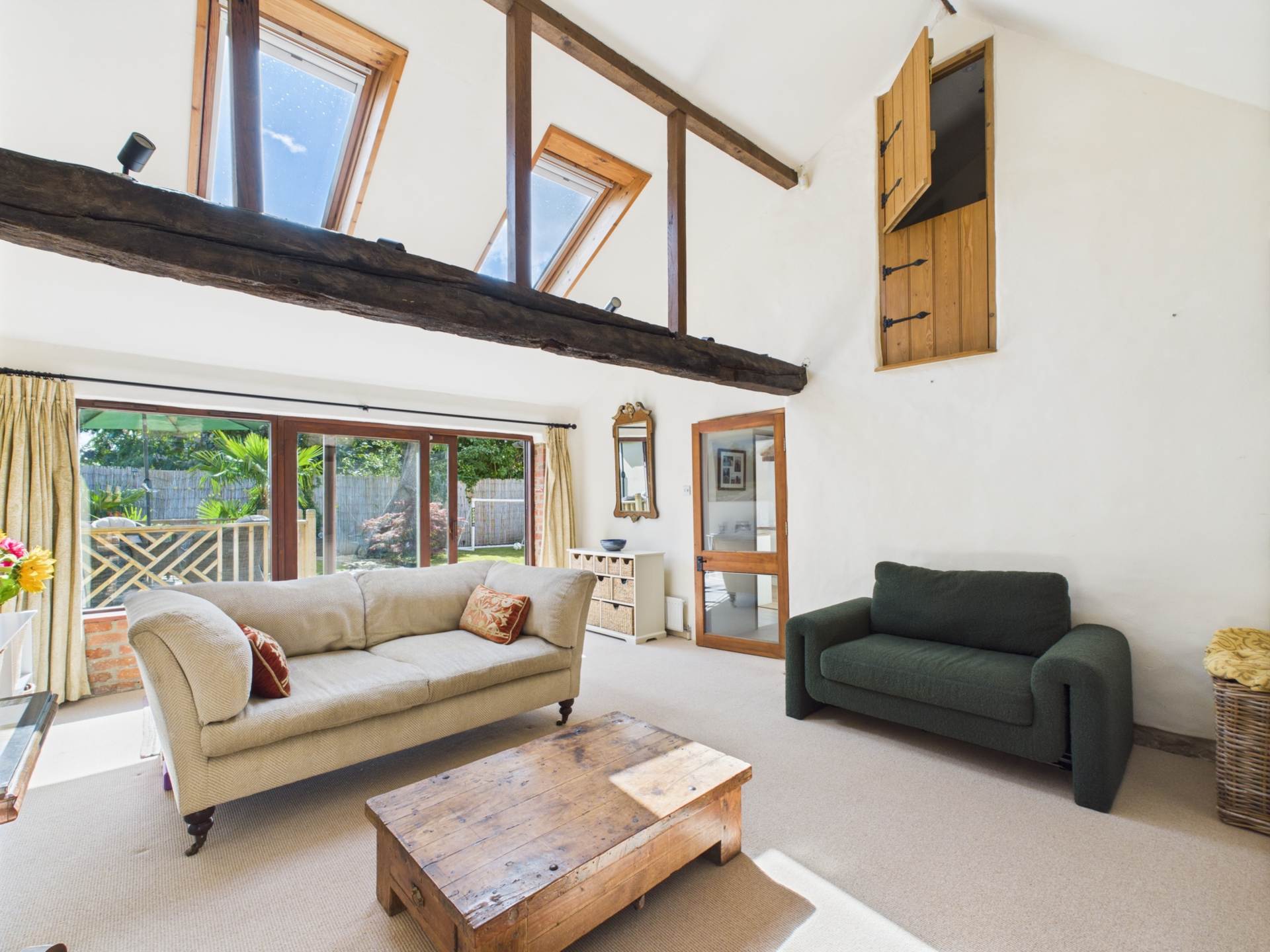 A welcoming entrance hall leads into a spacious main reception room, the former barn, full of character with original beams, a vaulted ceiling, log-burning stove, and Velux windows that flood the space with natural light. Sliding patio doors open onto a charming walled garden, offering seamless indoor-outdoor living.
