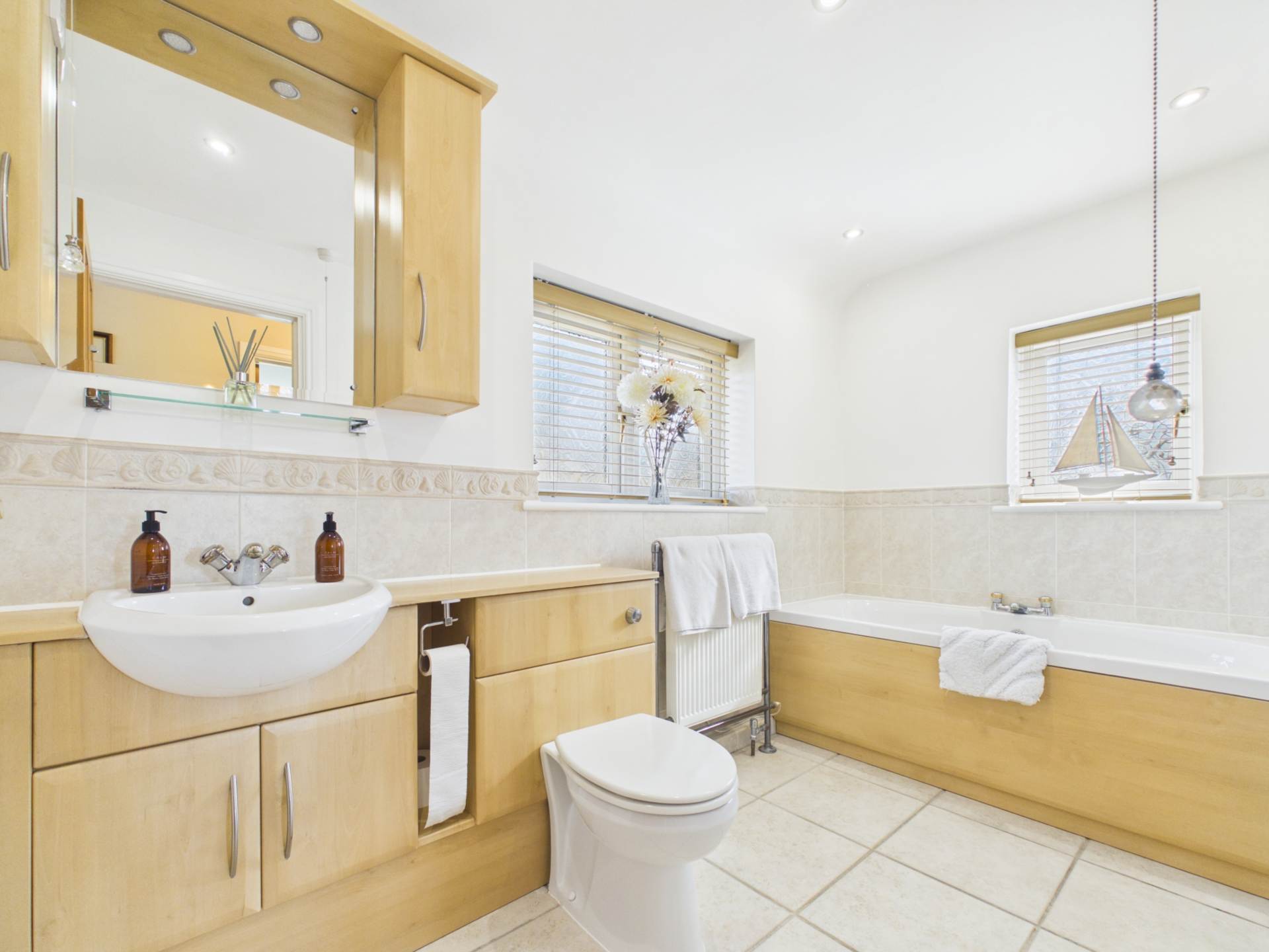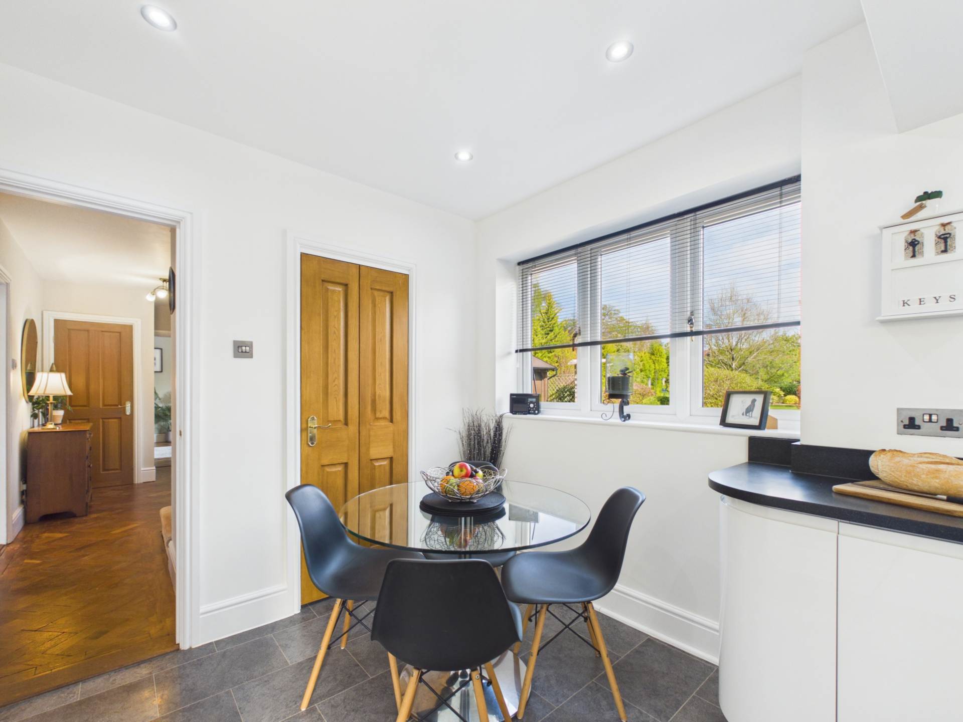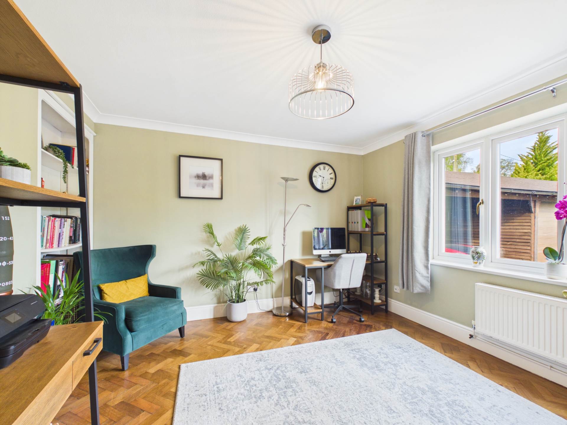A dining area with a glass table makes it a practical kitchen-breakfast space. From the kitchen is accessed a good size utility room, with doors to the single garage and rear garden. There is a separate downstairs study, ideal for purchasers who WFH and a separate downstairs WC.