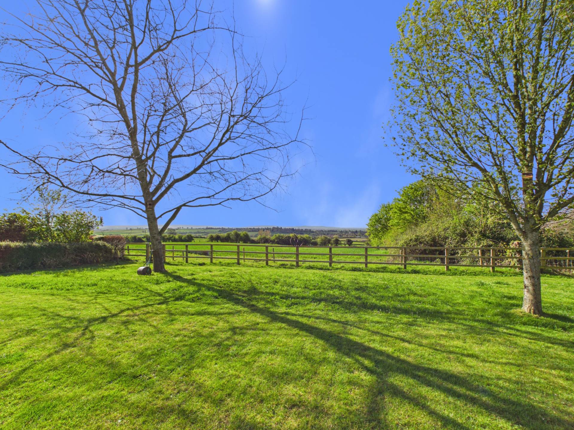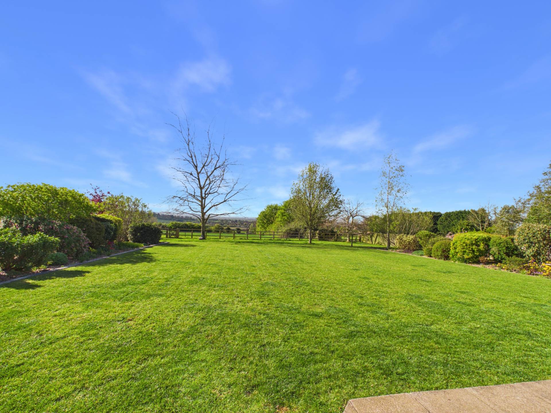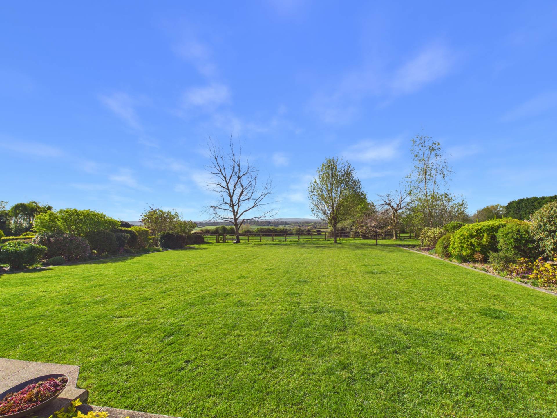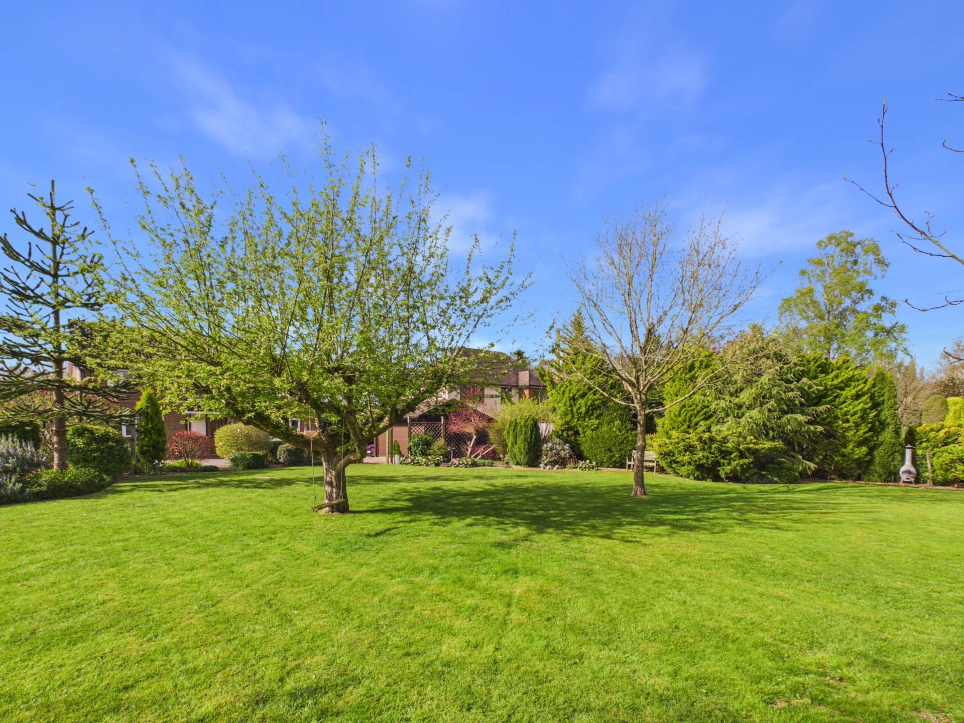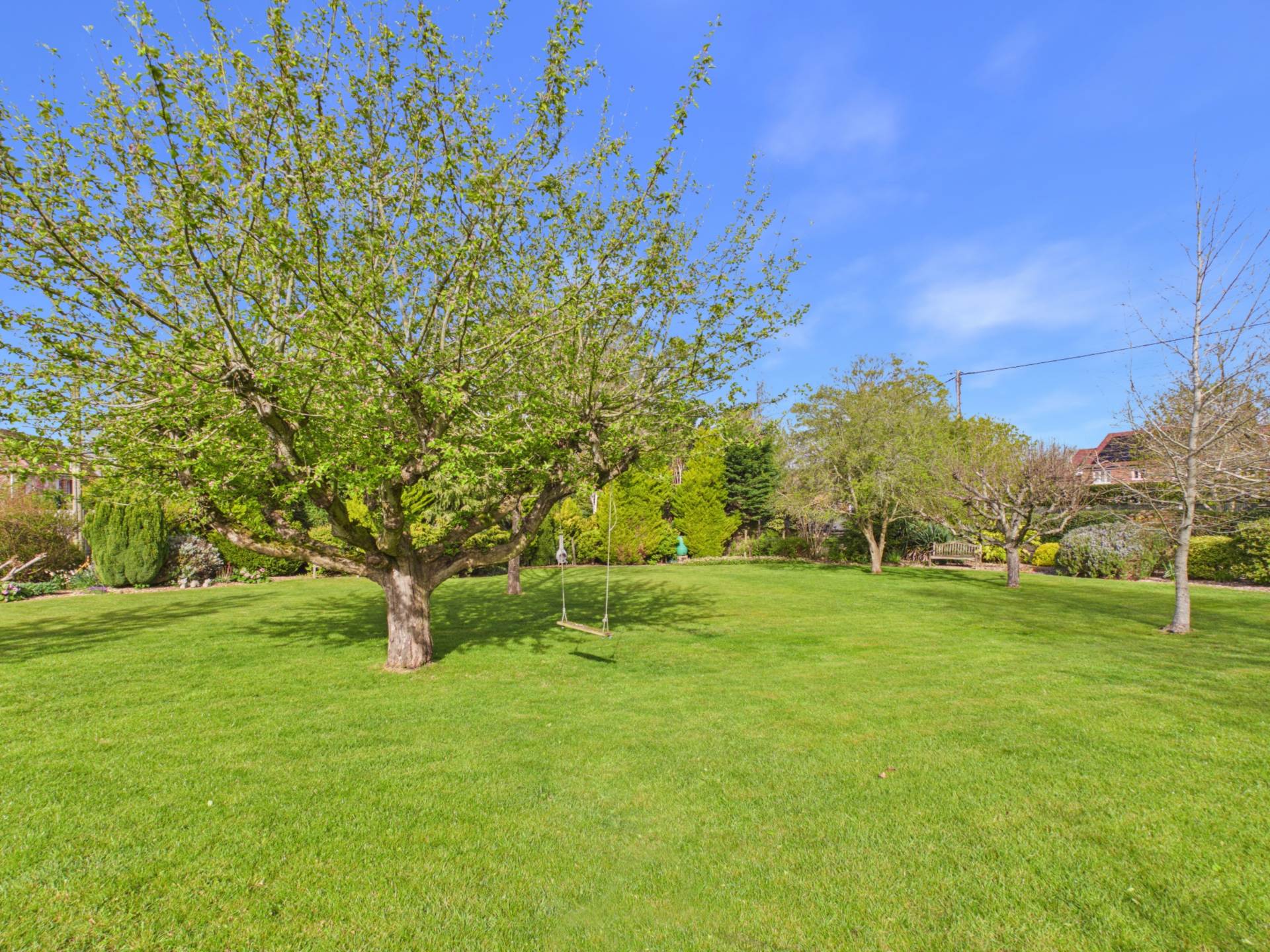 This impressive rear garden offers excellent space, privacy, and an open outlook. A large, well maintained lawn stretches from the house, creating a park-like feel ideal for families or entertaining. Mature borders with shrubs and trees add structure and privacy, while a rear fence opens to countryside views. Near the house, a patio and covered seating area provide a great spot for outdoor dining. Overall, it`s a generous, well balanced garden perfect for everyday use and entertaining.