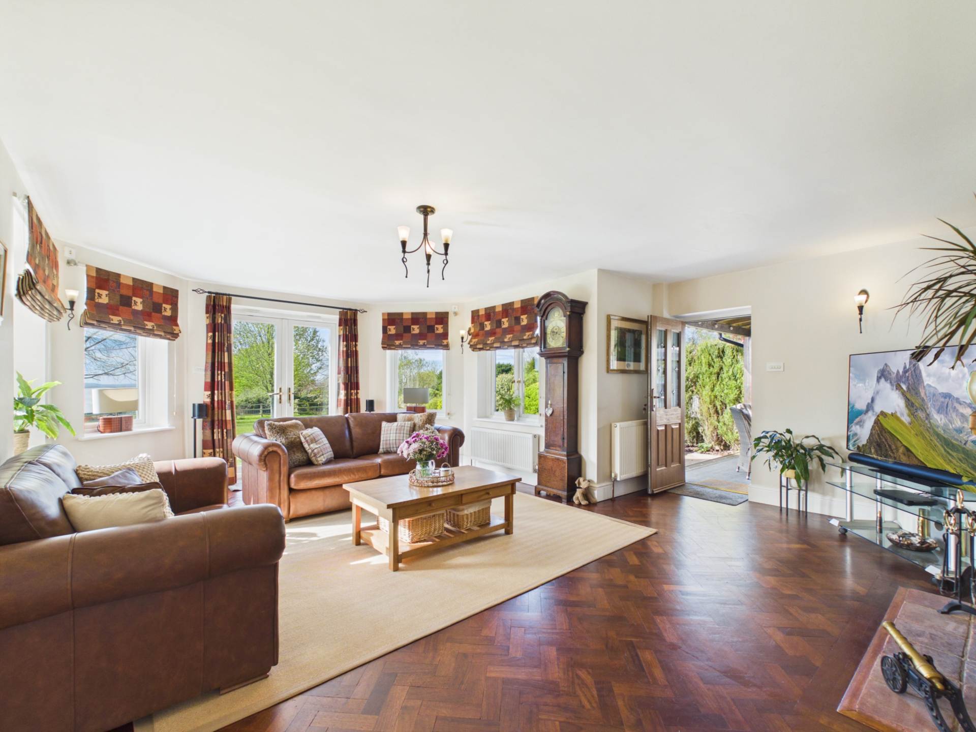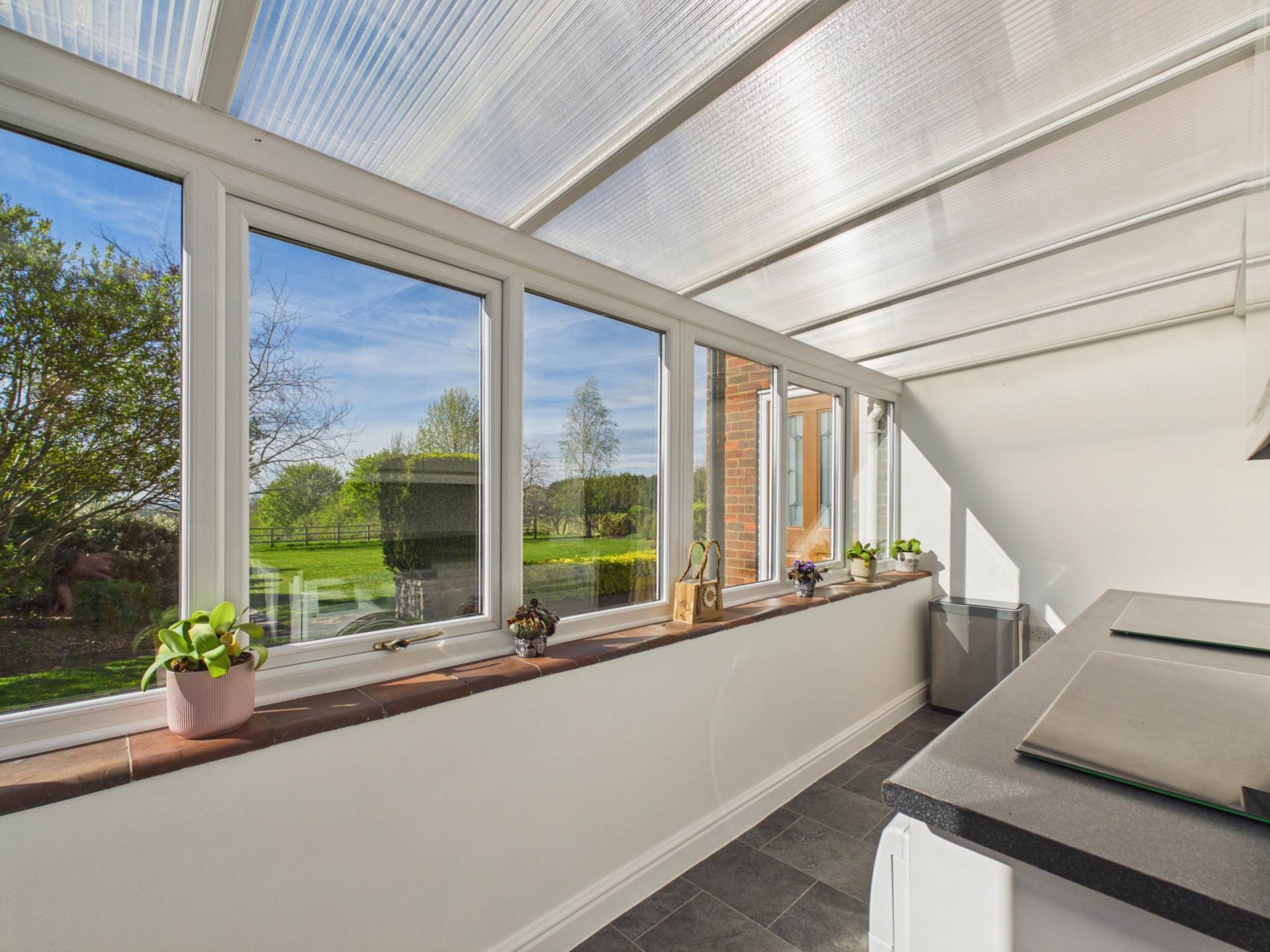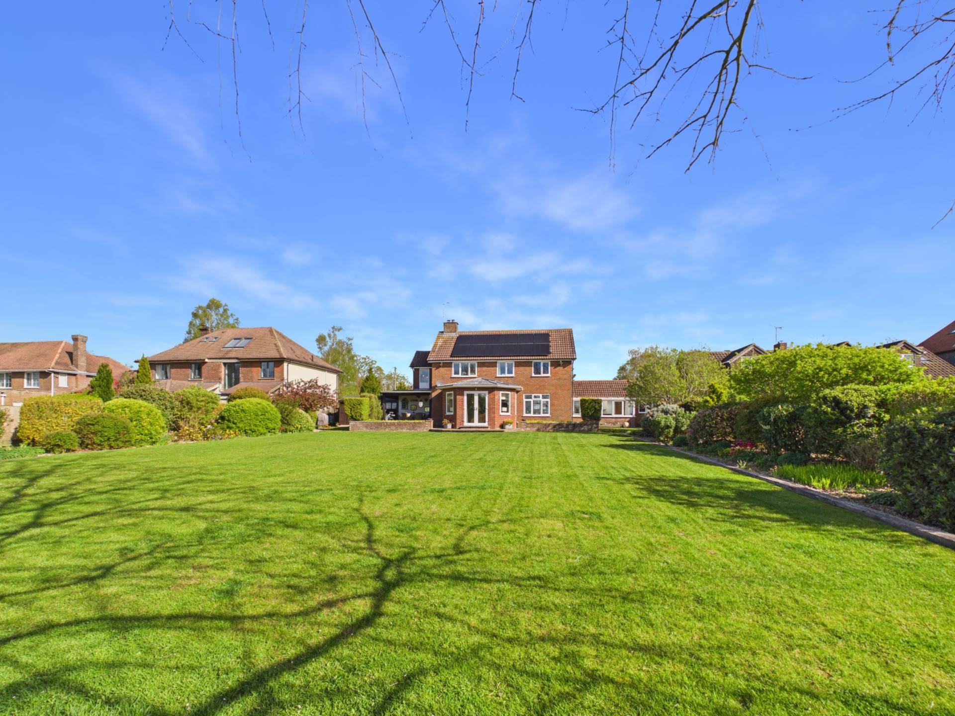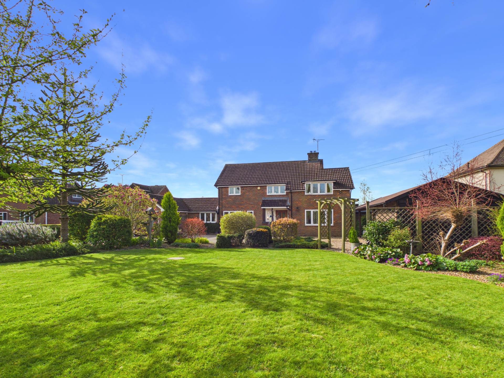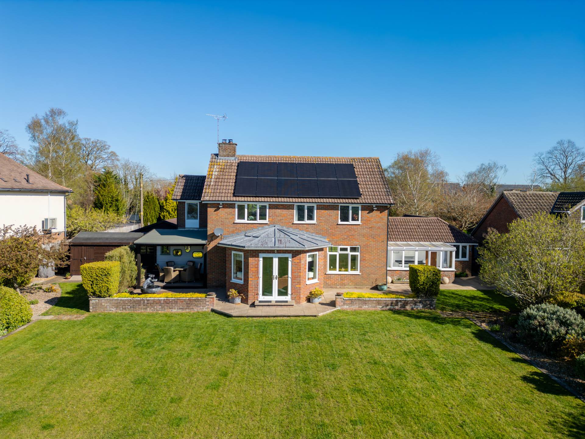 This impressive rear garden offers excellent space, privacy, and an open outlook. A large, well maintained lawn stretches from the house, creating a park-like feel ideal for families or entertaining. Mature borders with shrubs and trees add structure and privacy, while a rear fence opens to countryside views. Near the house, a patio and covered seating area provide a great spot for outdoor dining. Overall, it`s a generous, well balanced garden perfect for everyday use and entertaining.