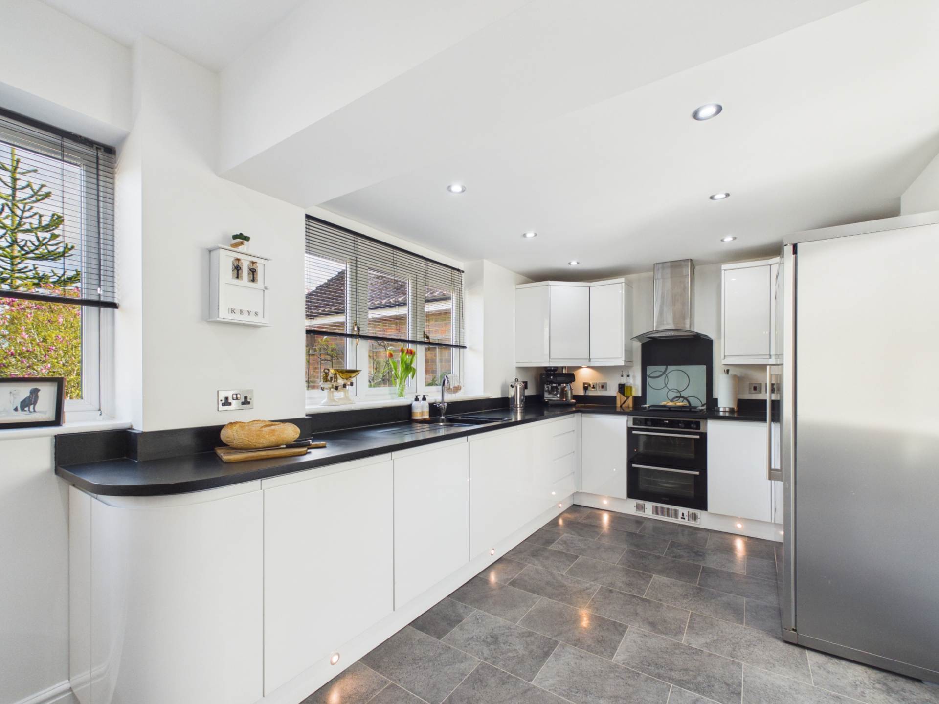 Sleek high gloss white cabinetry runs in an L-shape, paired with dark worktops for contrast. Integrated appliances, including a double oven, sit alongside a modern extractor and glass splashback.