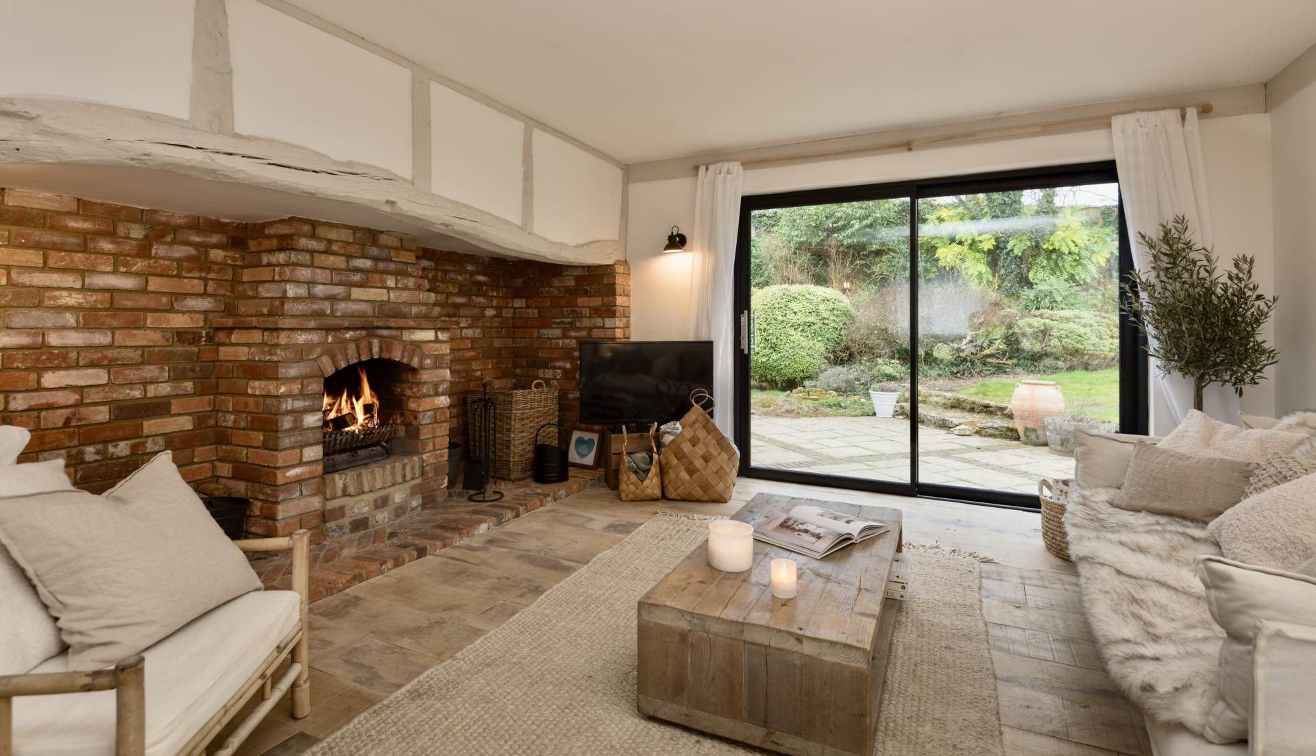 Steel framed glazed doors lead into the inviting living room, where the impressive inglenook fireplace forms the heart of the space perfect for cosy evenings. Beyond, a bright and airy conservatory offers a peaceful spot to relax while overlooking the garden.