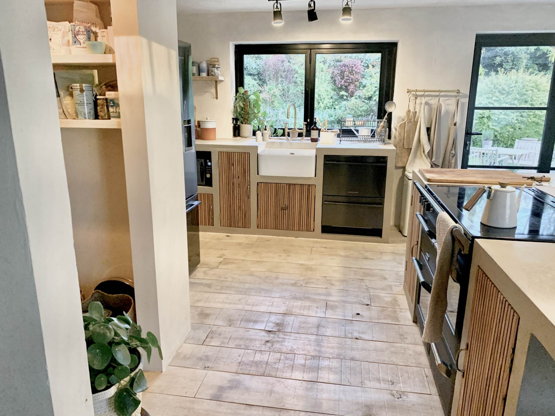 The property has been fully refurbished throughout, featuring beautiful oak flooring and showcasing its original beams and timbers. Upon entering through a welcoming porch, you`re greeted by a stunning open plan kitchen and dining area with a Mediterranean feel. The bespoke kitchen includes a micro-cement island and counter tops, complemented by a bifolding window behind the butler`s sink, seamlessly connecting the indoors to the garden. Large sliding doors open directly onto the terrace, creating a wonderful flow for indoor-outdoor living and entertaining.