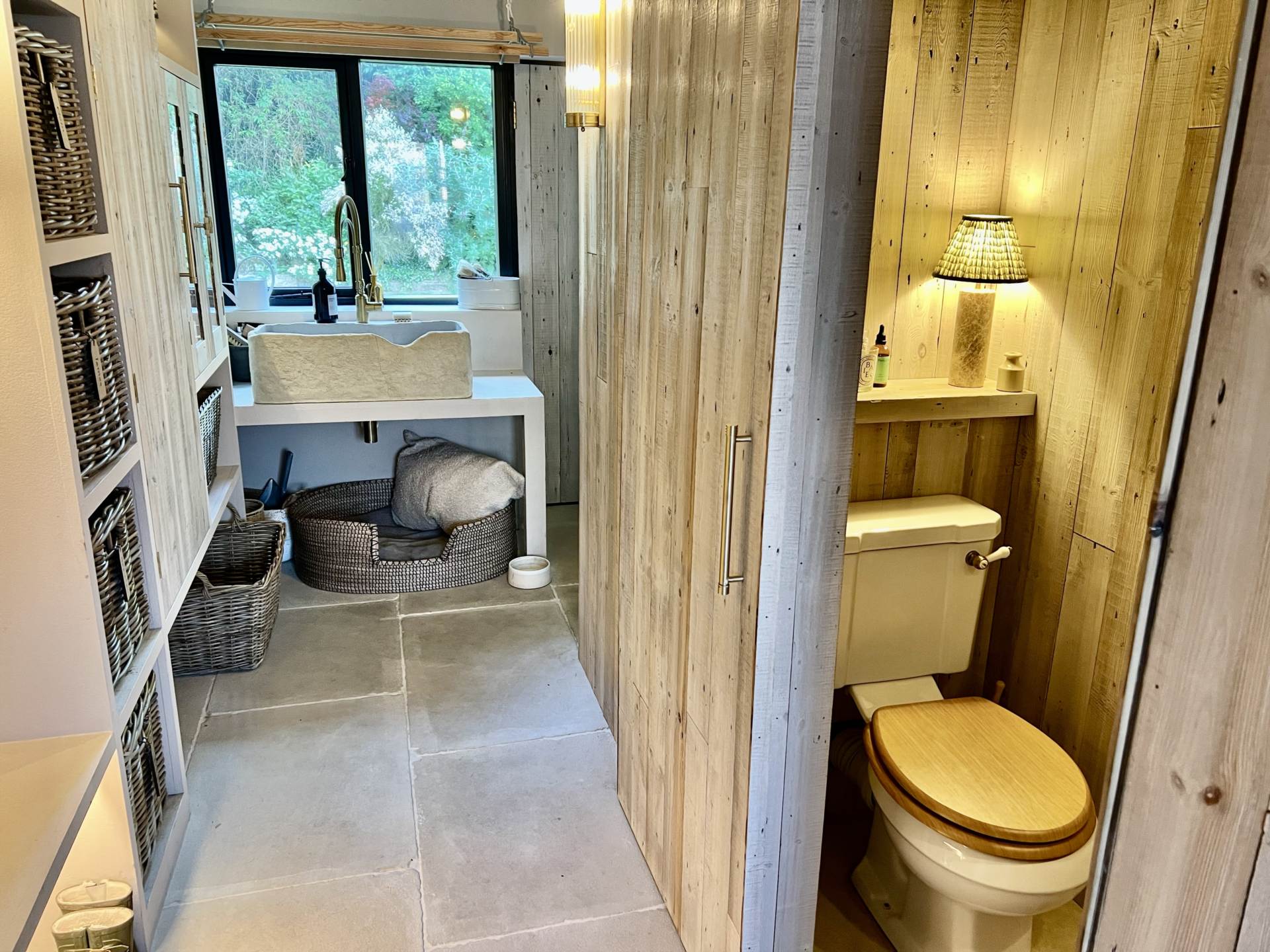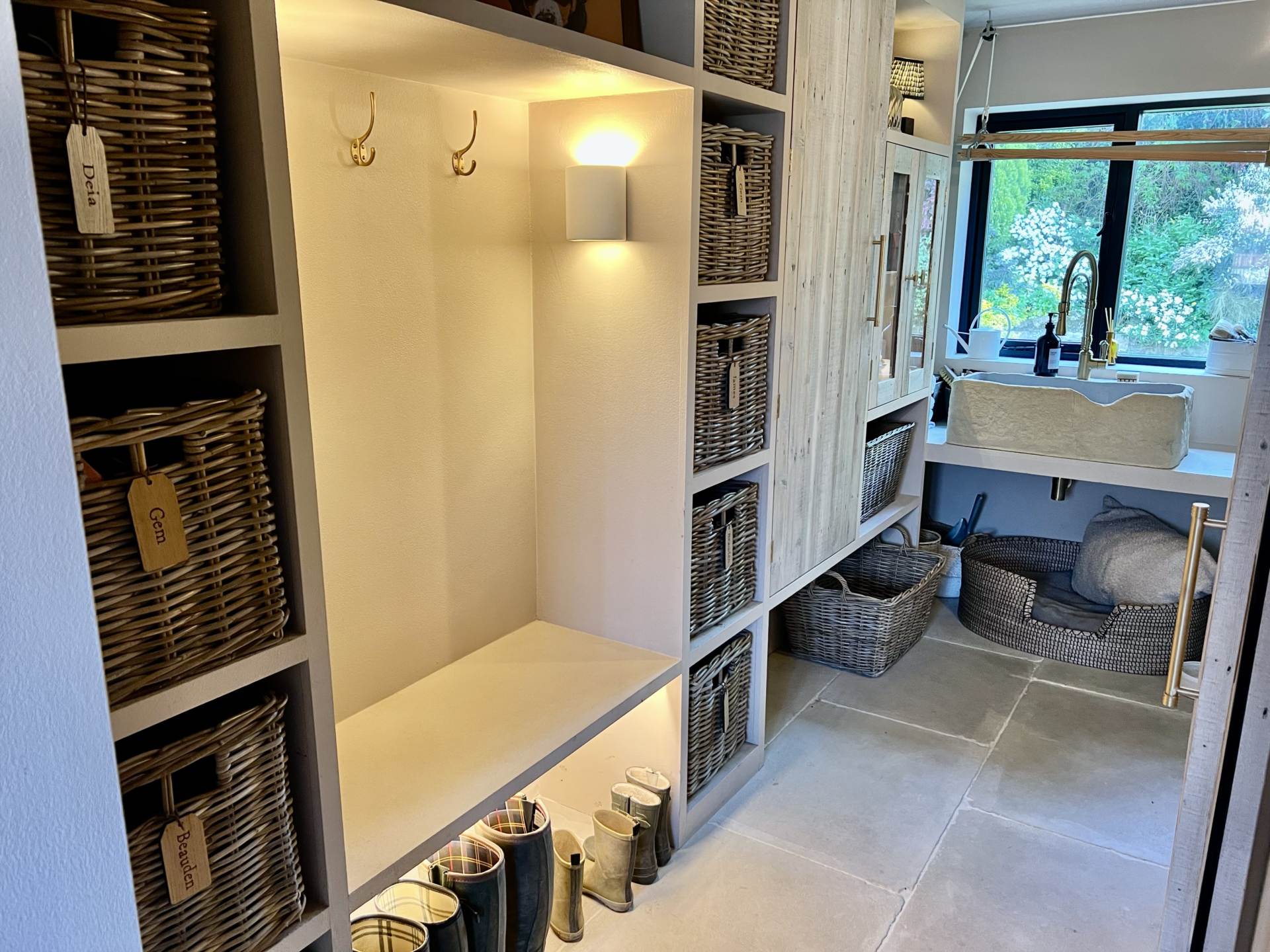 Behind the kitchen lies a beautifully designed wooden-clad utility and boot room, complete with garden access, a downstairs WC, utility sink, plumbing for a washing machine and tumble dryer, and ample storage space.