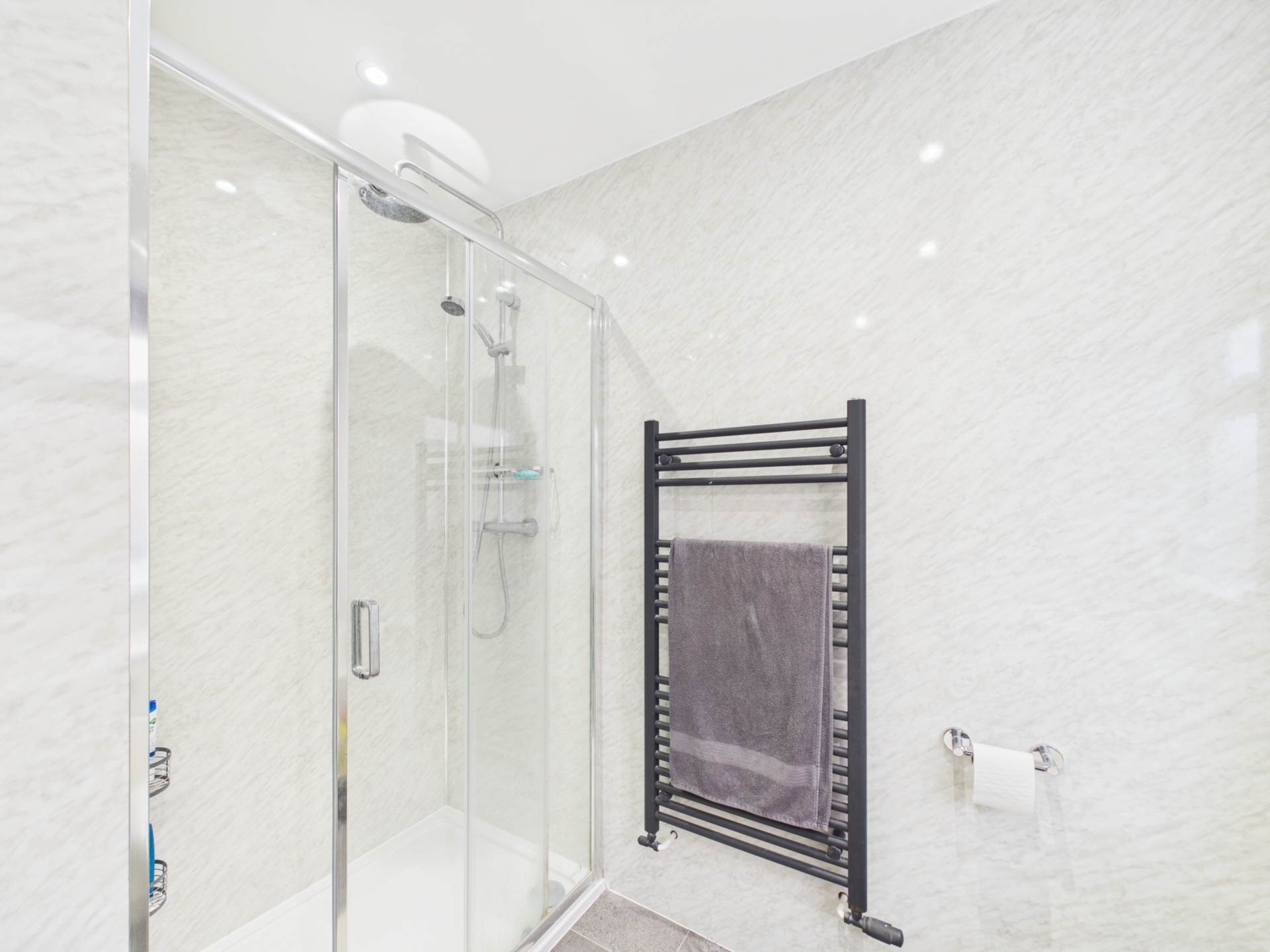 The property offers three well-proportioned bedrooms, including a principal bedroom with en-suite shower room, a second double bedroom, and a third bedroom currently arranged as a home office or study, complemented by a modern family bathroom.