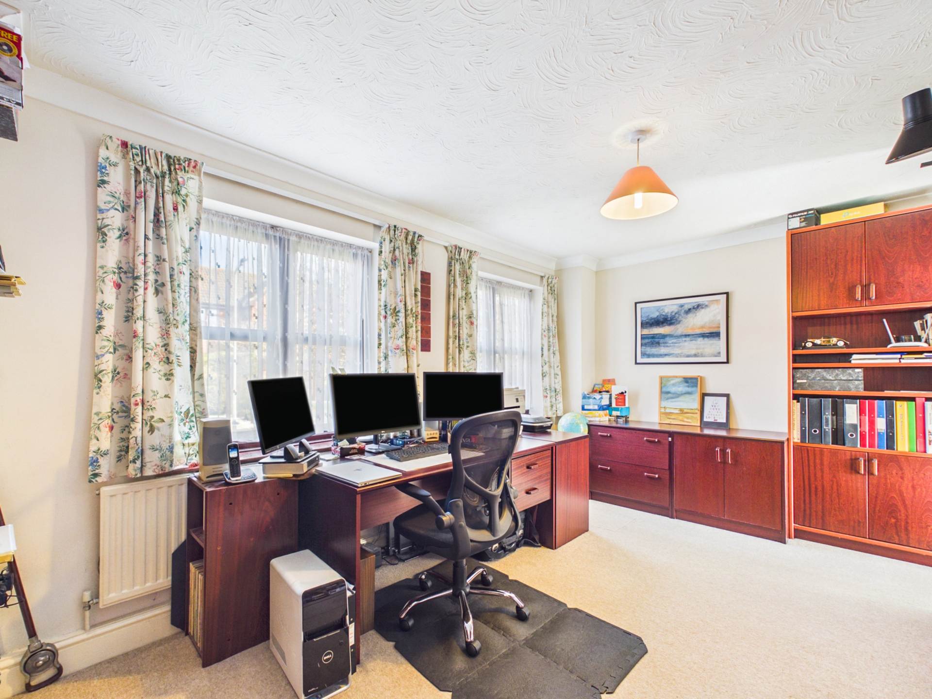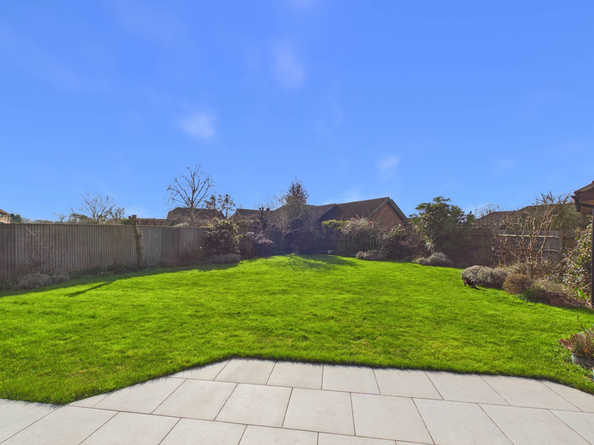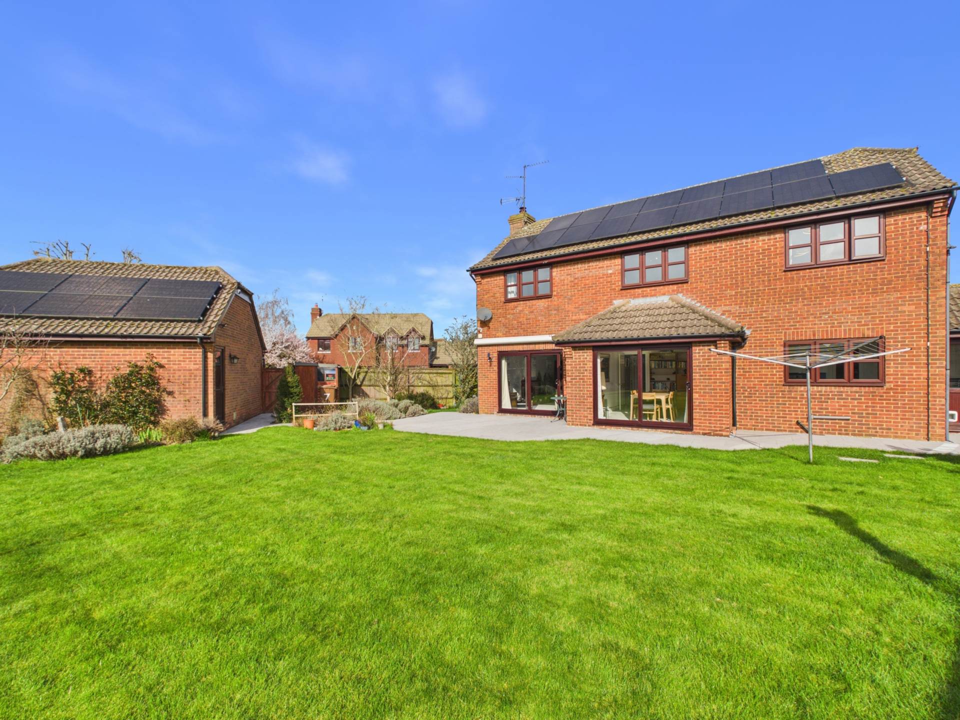 The property offers flexible accommodation including five bedrooms, two bathrooms, three reception rooms, a well appointed kitchen with walk-in larder, utility room, entrance hall with storage, and a ground floor cloakroom. The dual aspect main lounge runs from front to back, featuring patio doors to the rear garden and a brick fireplace with gas fire. An electric patio sunshade helps keep the room cool during warmer months. Two further reception rooms are currently used as a dining room and study, both offering versatile use. The kitchen provides ample storage, double ovens, a gas hob with extractor, and garden views, with doors leading to the dining room, study, and utility room. Upstairs, a spacious landing leads to the principal bedroom with fitted wardrobes and a large en-suite, alongside four further double bedrooms and a family bathroom. The landing also benefits from an airing cupboard and loft access. The front of the property features an in-and-out driveway and mature planting. To the rear, a private south-facing garden offers established borders, a newly laid patio, and a generous lawn, ideal for entertaining or family life. A side garden provides space for vegetable growing. A detached double garage includes an electric up-and-over door, rear access, loft storage, power and lighting, an EV charging point, and completes this well-balanced home.