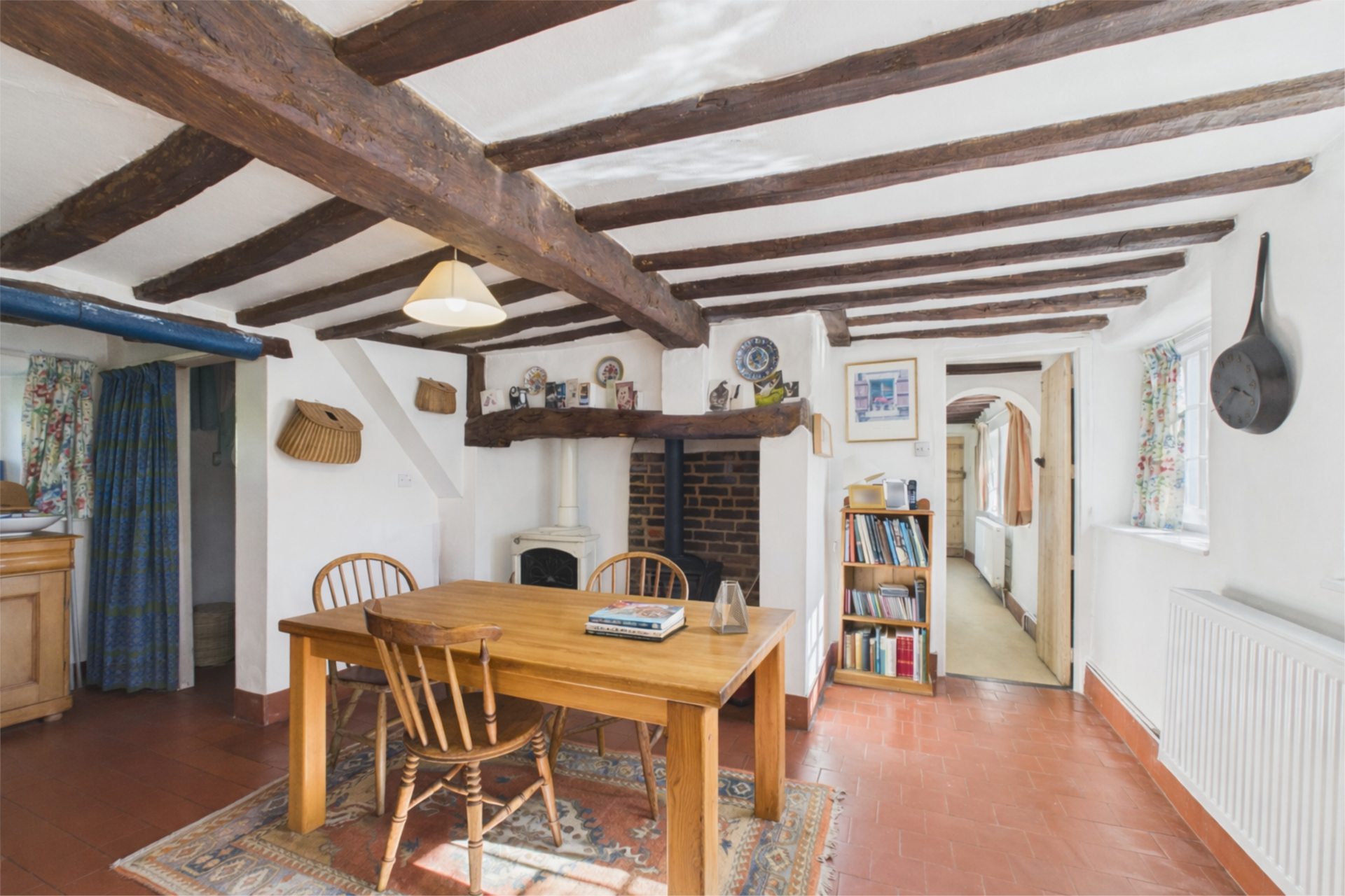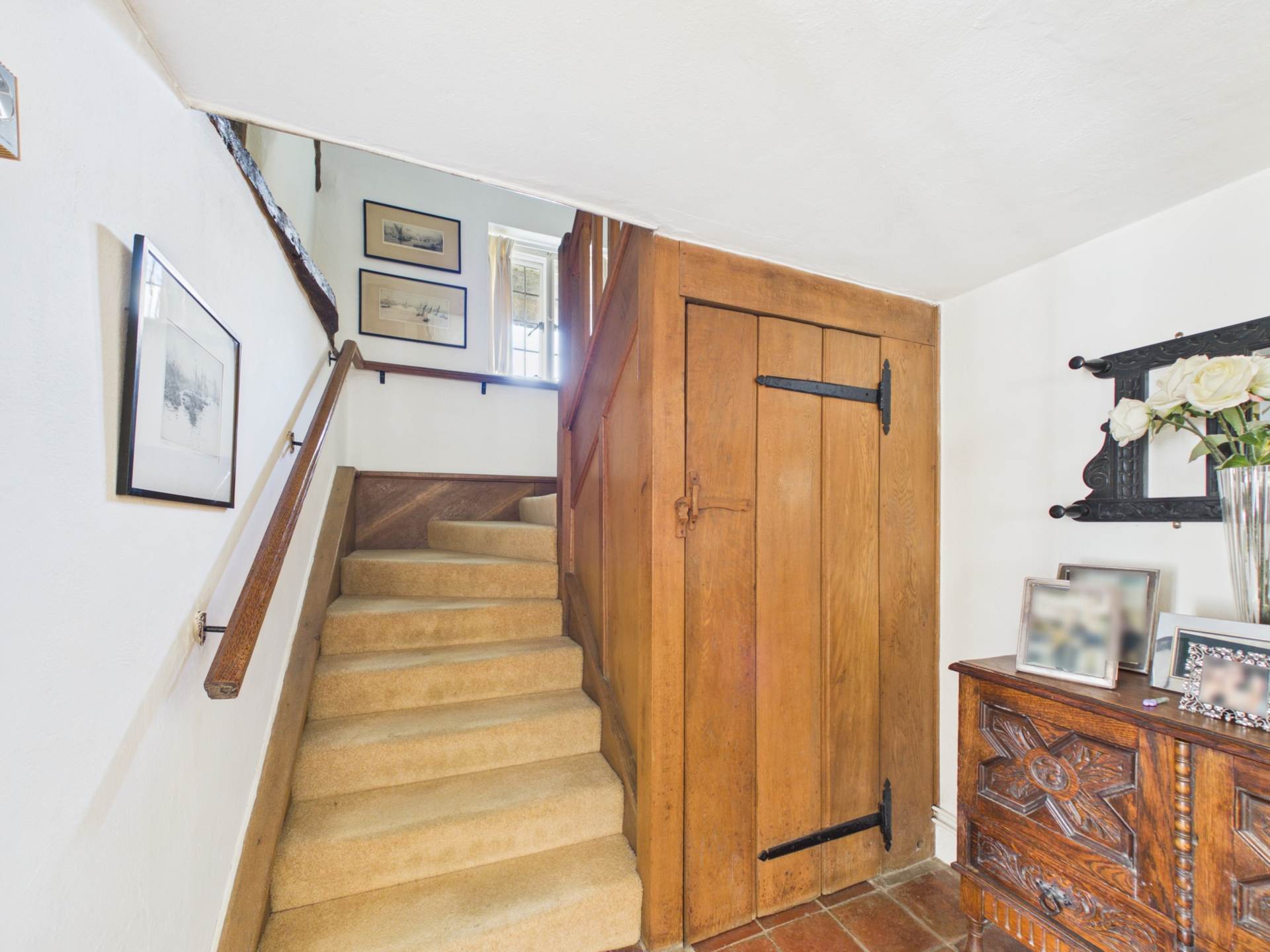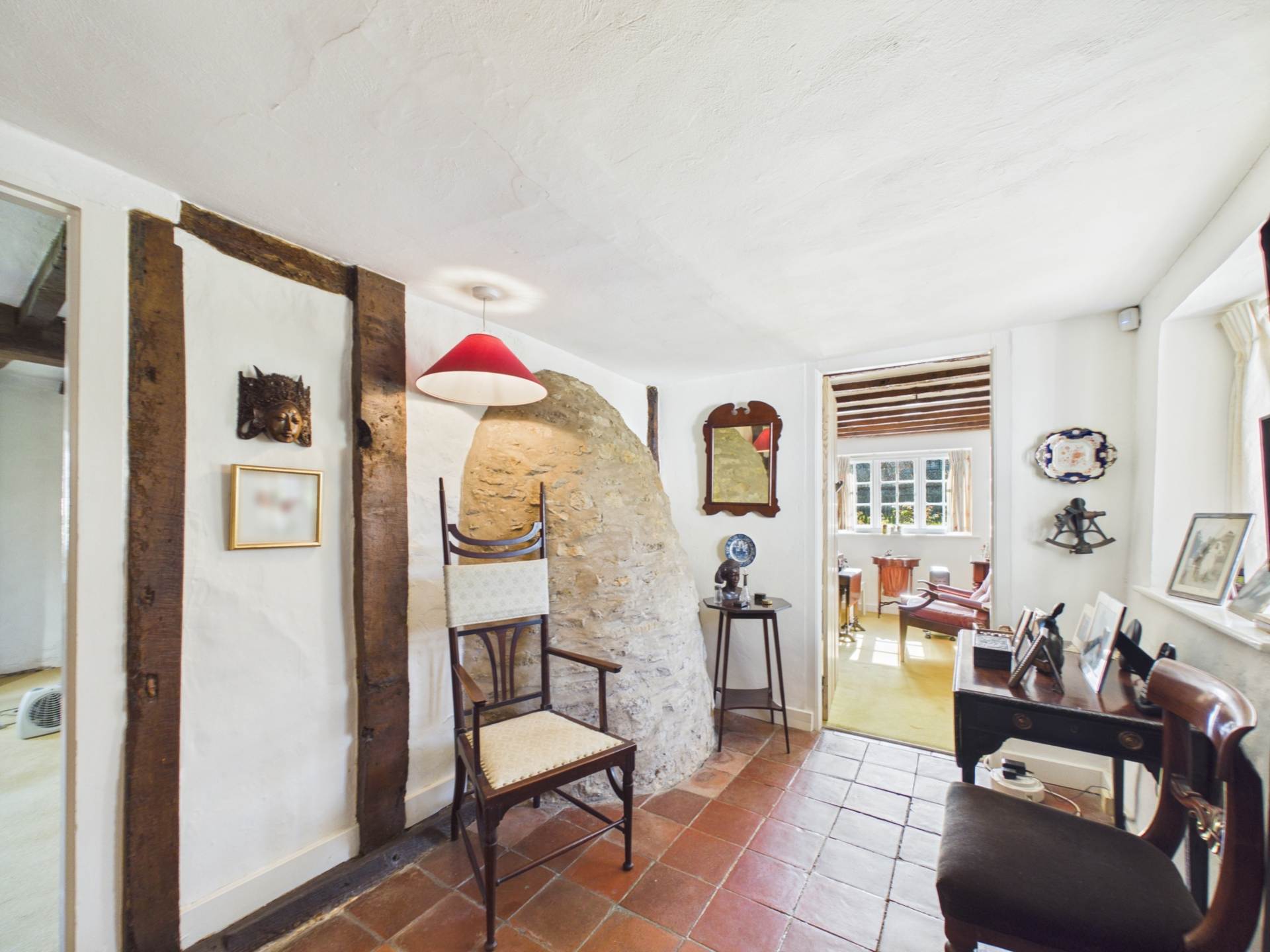 The property is entered via a welcoming entrance hall, where an original bread oven provides an immediate sense of history and authenticity. From here, the accommodation unfolds into a series of elegant and characterful reception spaces. The principal living room is a warm and inviting setting, centred around a wood-burning stove and enjoying picturesque views over the gardens and rose beds. A second reception room, currently utilised as a home office, offers excellent flexibility and could serve equally well as a ground floor bedroom, playroom or additional sitting room, with convenient access to a downstairs WC. A useful understairs cupboard, currently arranged as a wine store, adds further practicality.