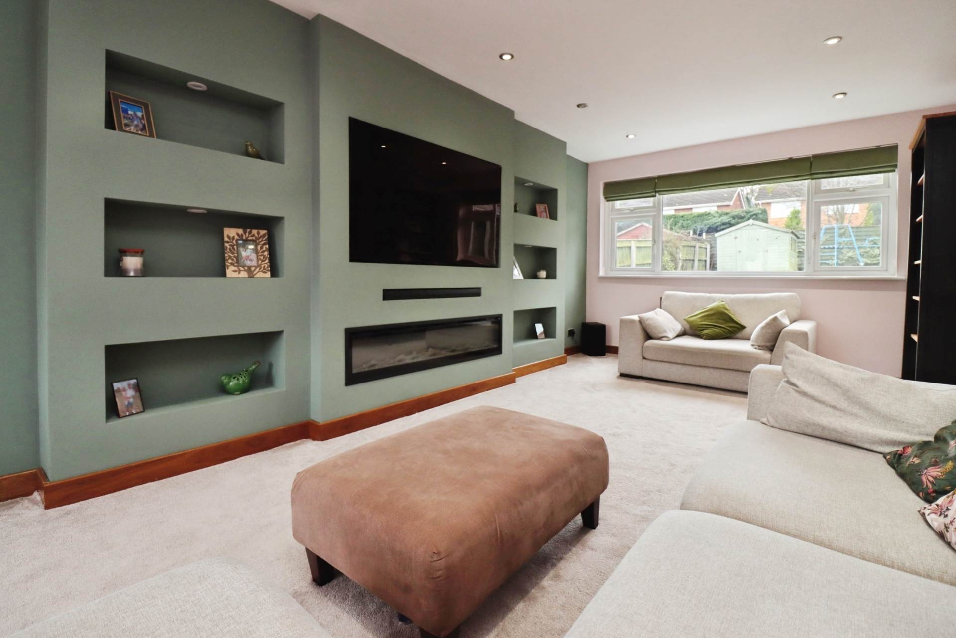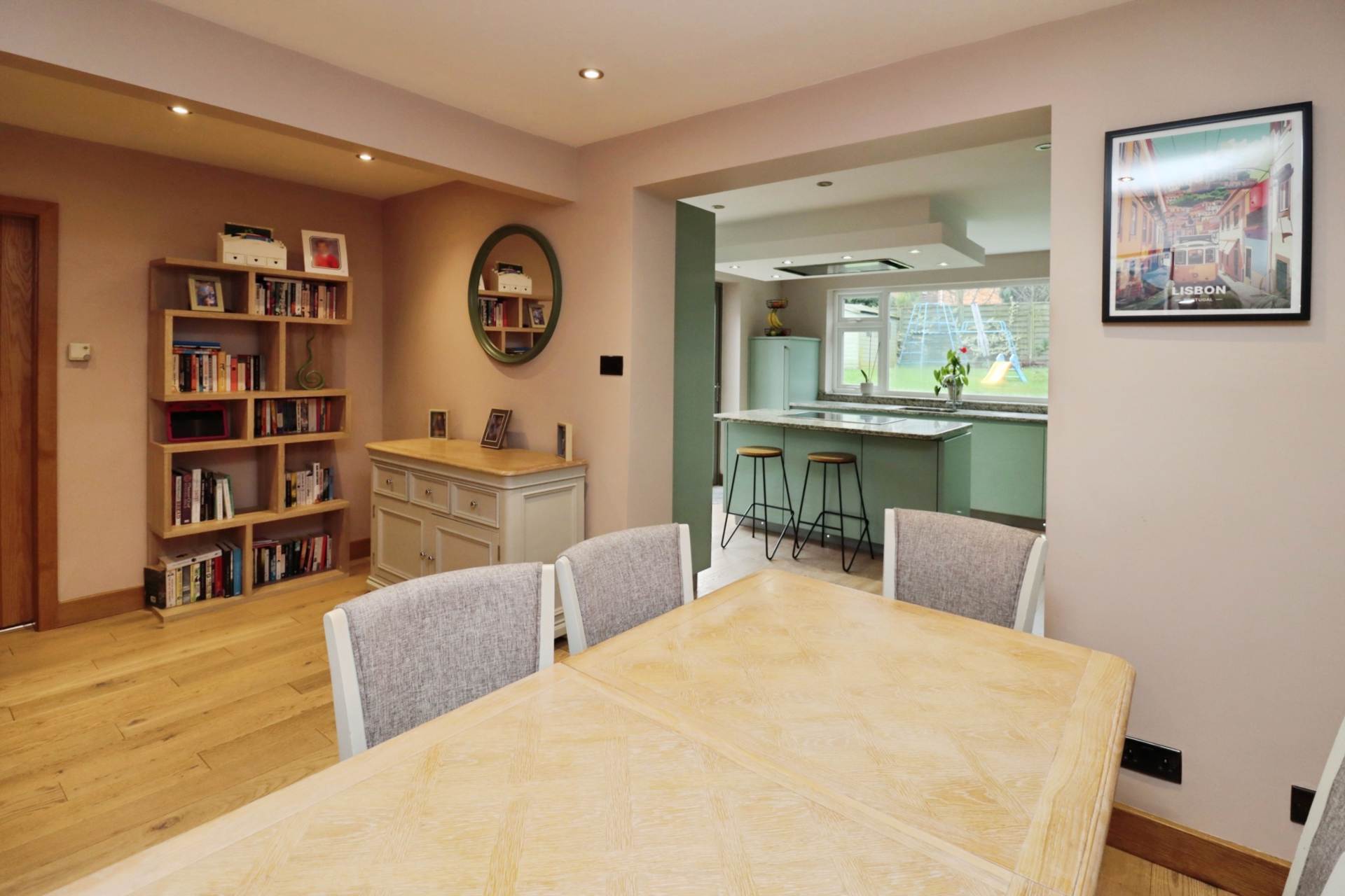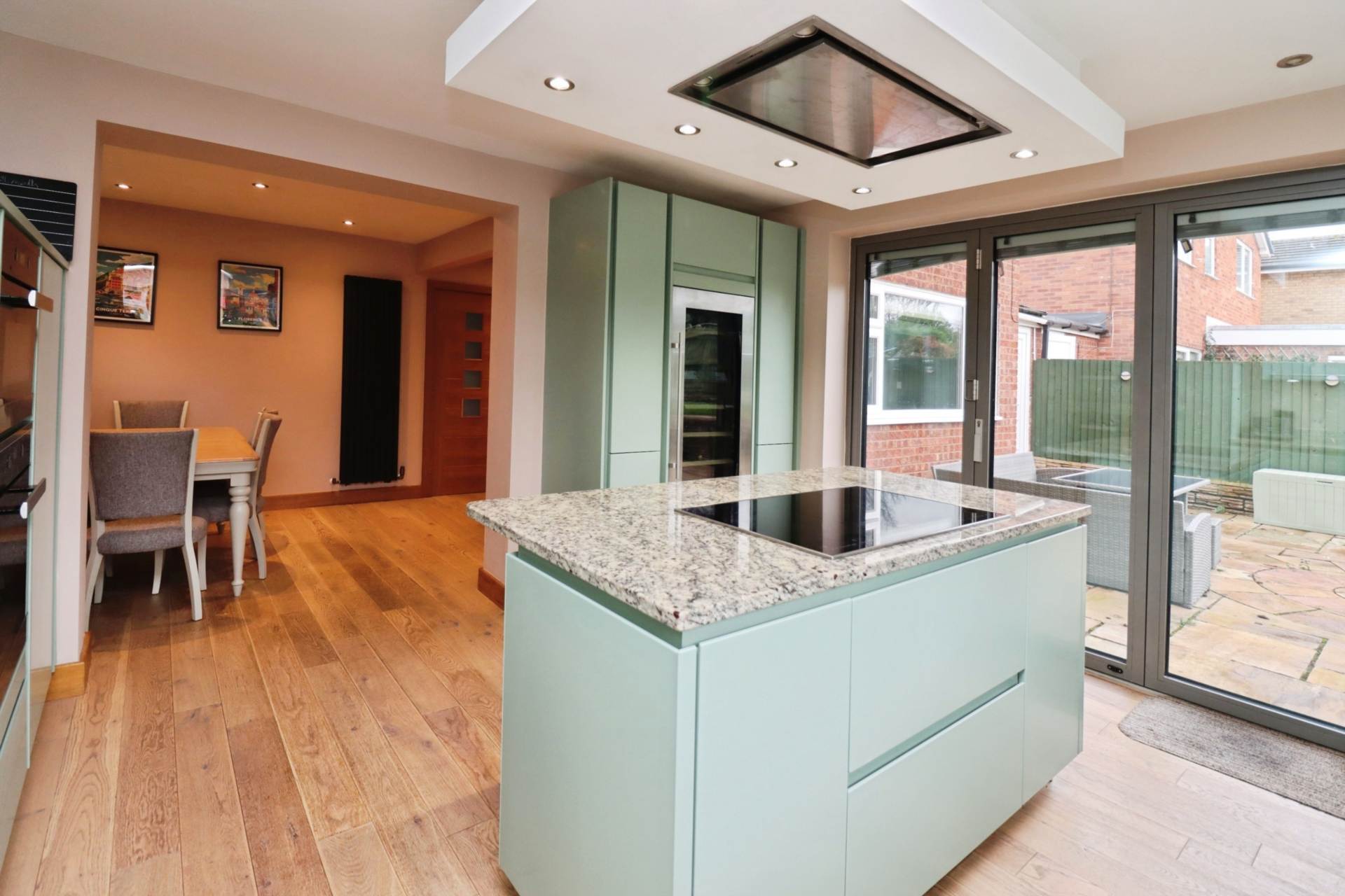 Straight ahead, the home opens into a stunning open-plan kitchen and dining area, ideal for modern family living and entertaining. The contemporary kitchen boasts a central island, extensive cupboard space, and stylish bi-fold doors that seamlessly connect the indoor space to the rear garden. Just off the dining area is a generously sized lounge, featuring an impressive media wall that creates a warm and inviting space for relaxing evenings.