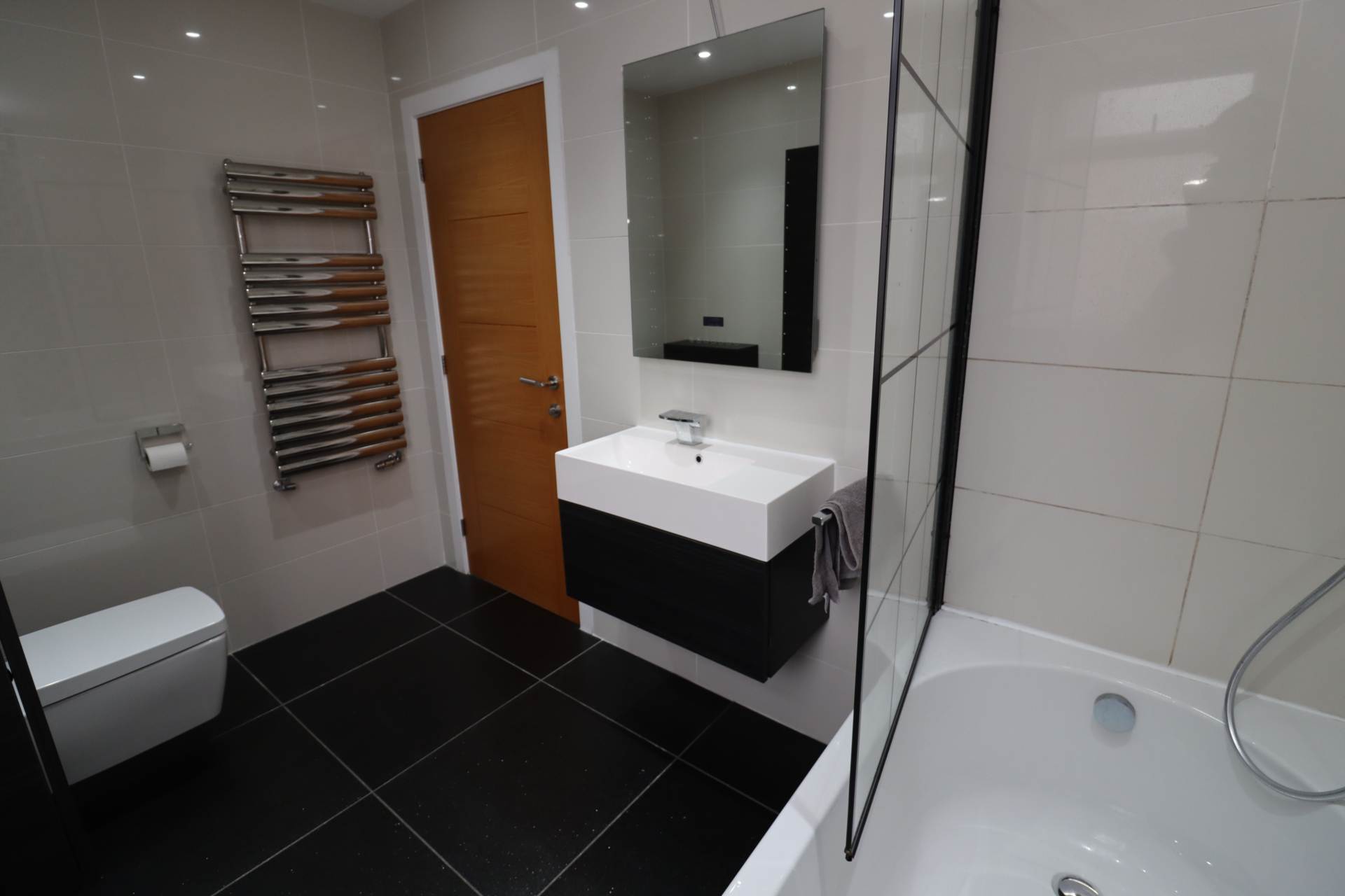 The first floor offers four well-proportioned double bedrooms. The master bedroom benefits from fitted wardrobes and a sleek en-suite shower room, while two further bedrooms also include built-in wardrobes. A modern four-piece family bathroom completes the accommodation.