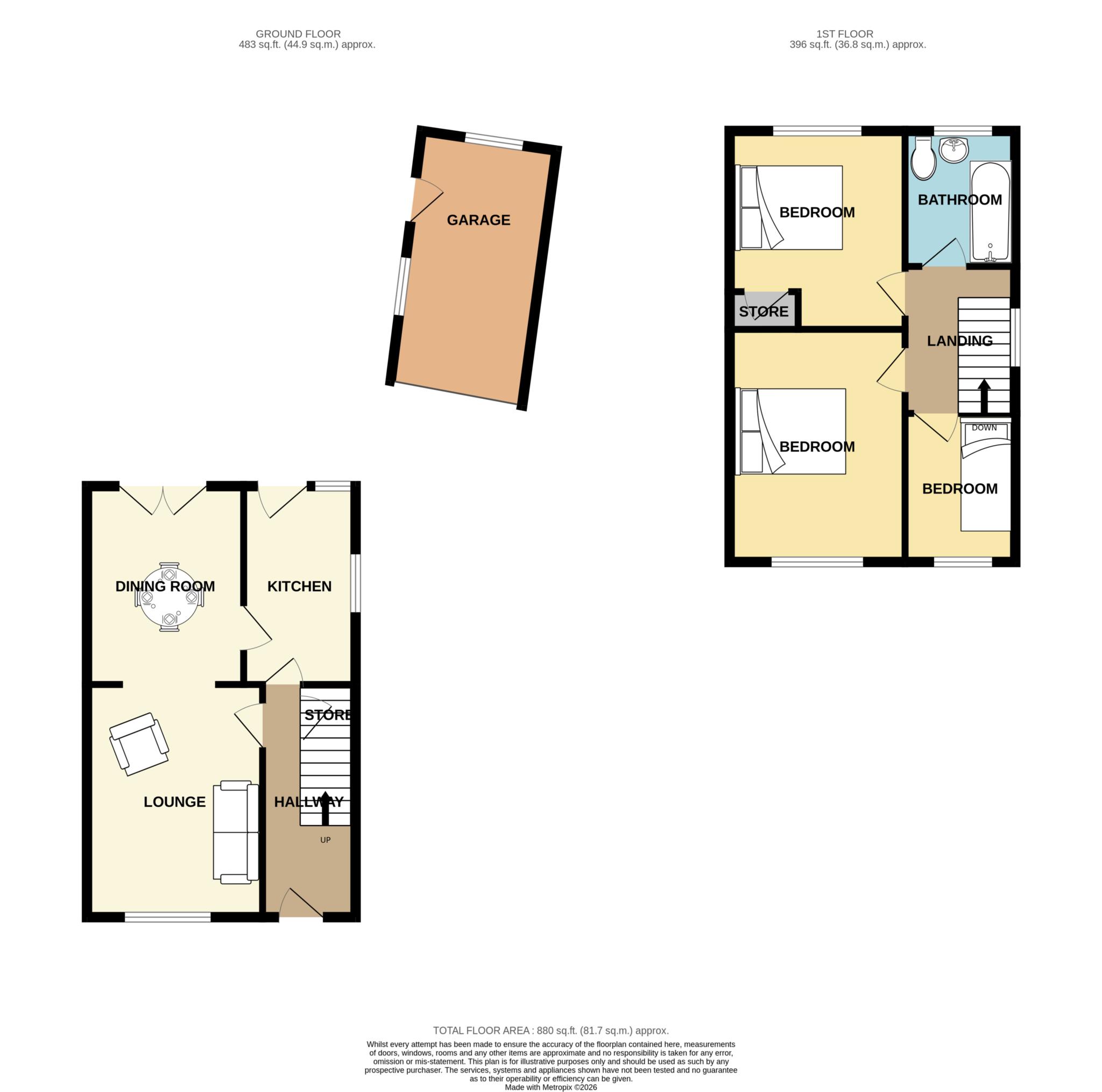 Entrance Hall - 13'8" (4.17m) x 6'3" (1.91m)Lounge - 12'10" (3.91m) x 10'2" (3.1m)Dining Room - 10'8" (3.25m) x 8'6" (2.59m)Kitchen - 11'6" (3.51m) x 8'6" (2.59m)Bedroom One - 13'0" (3.96m) x 10'5" (3.18m)Bedroom Two - 10'11" (3.33m) x 10'0" (3.05m)Bedroom Three - 9'7" (2.92m) x 6'7" (2.01m)Bathroom - 7'4" (2.24m) x 6'4" (1.93m)Garage - 20'6" (6.25m) x 11'10" (3.61m)