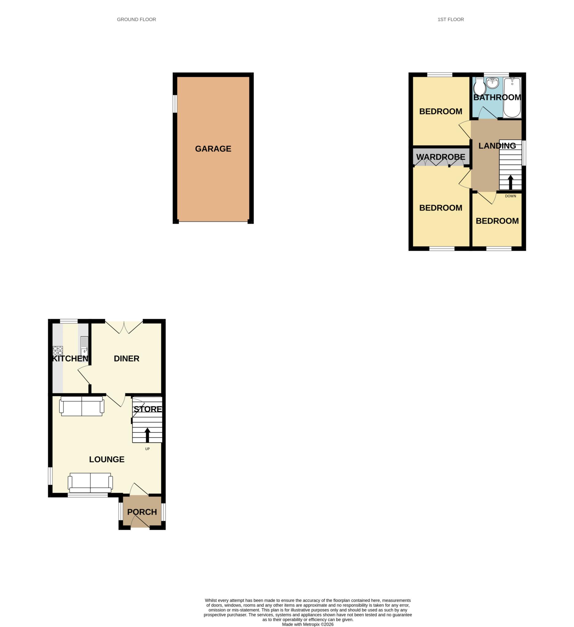 Entrance Hall - 6'2" (1.88m) x 4'9" (1.45m)Lounge - 15'0" (4.57m) x 13'3" (4.04m)Dining Room - 9'8" (2.95m) x 7'11" (2.41m)Kitchen - 9'11" (3.02m) x 6'6" (1.98m)Bedroom One - 18'5" (5.61m) x 14'6" (4.42m)Bedroom Two - 9'5" (2.87m) x 8'6" (2.59m)Bedroom Three - 10'1" (3.07m) x 5'11" (1.8m)Bathroom - 5'11" (1.8m) x 5'3" (1.6m)Garage - 17'0" (5.18m) x 8'1" (2.46m)