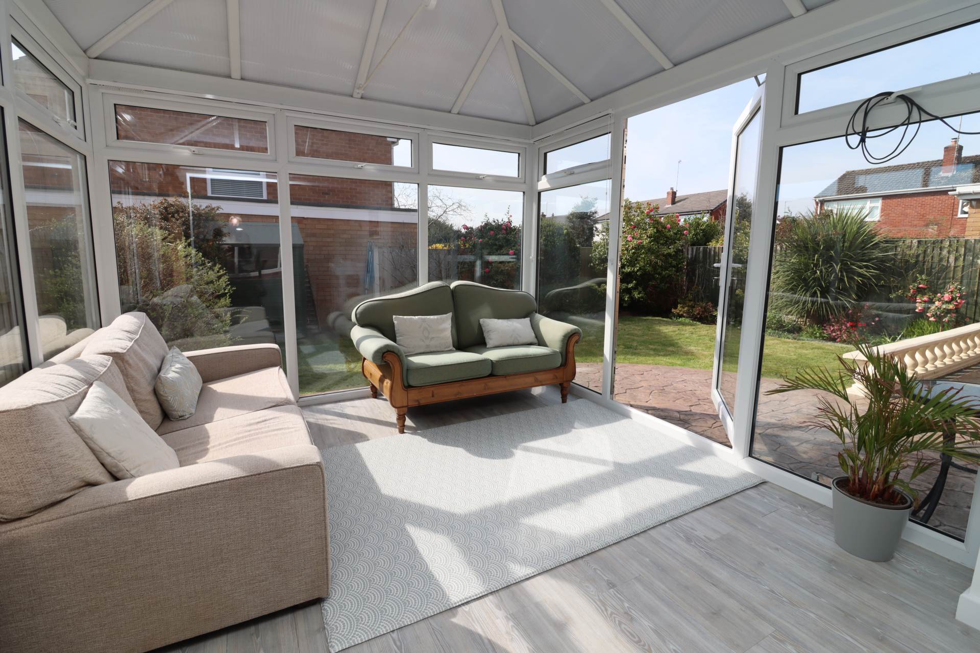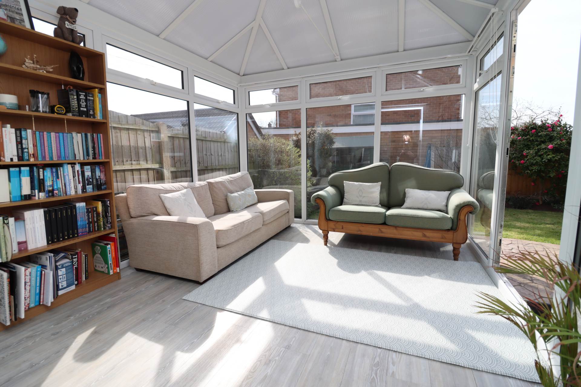Outside, the rear garden enjoys a sunny aspect, offering an ideal setting for outdoor dining and relaxation.
