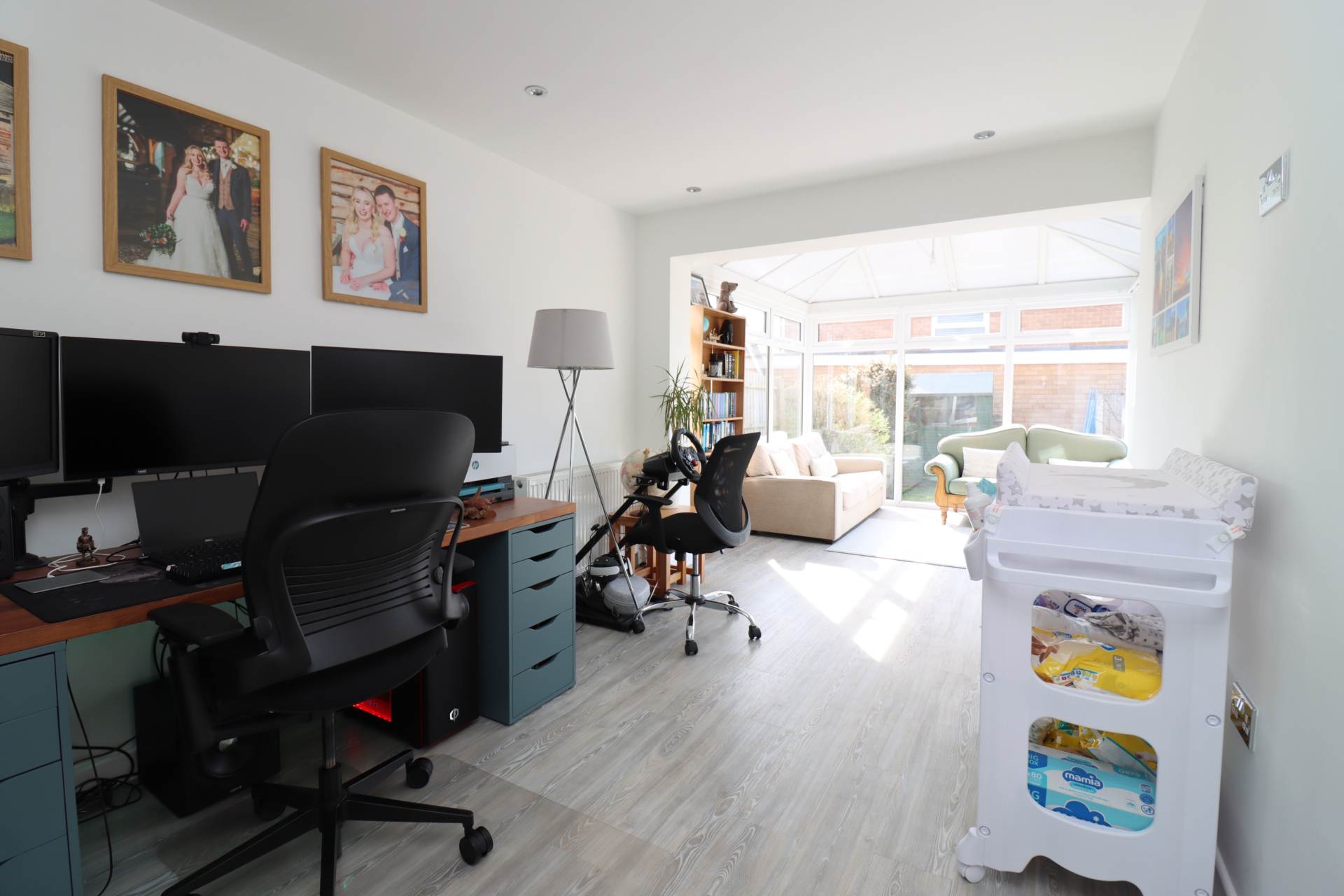 The property further benefits from an extended office room, which flows seamlessly into an open-plan conservatory, creating a bright and flexible living or working area with views over the garden. A separate utility room adds further convenience and additional storage.