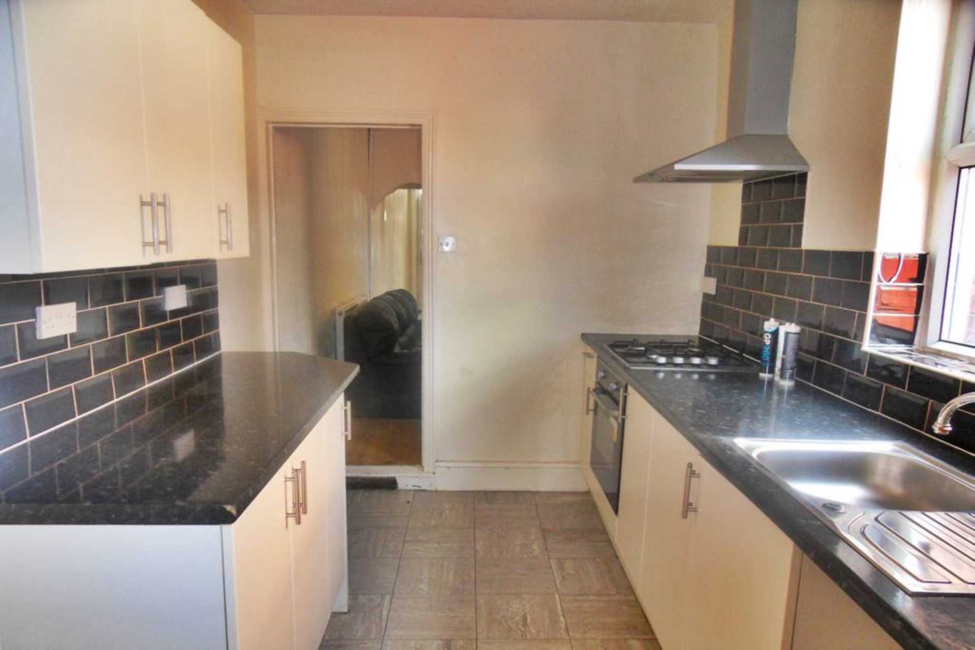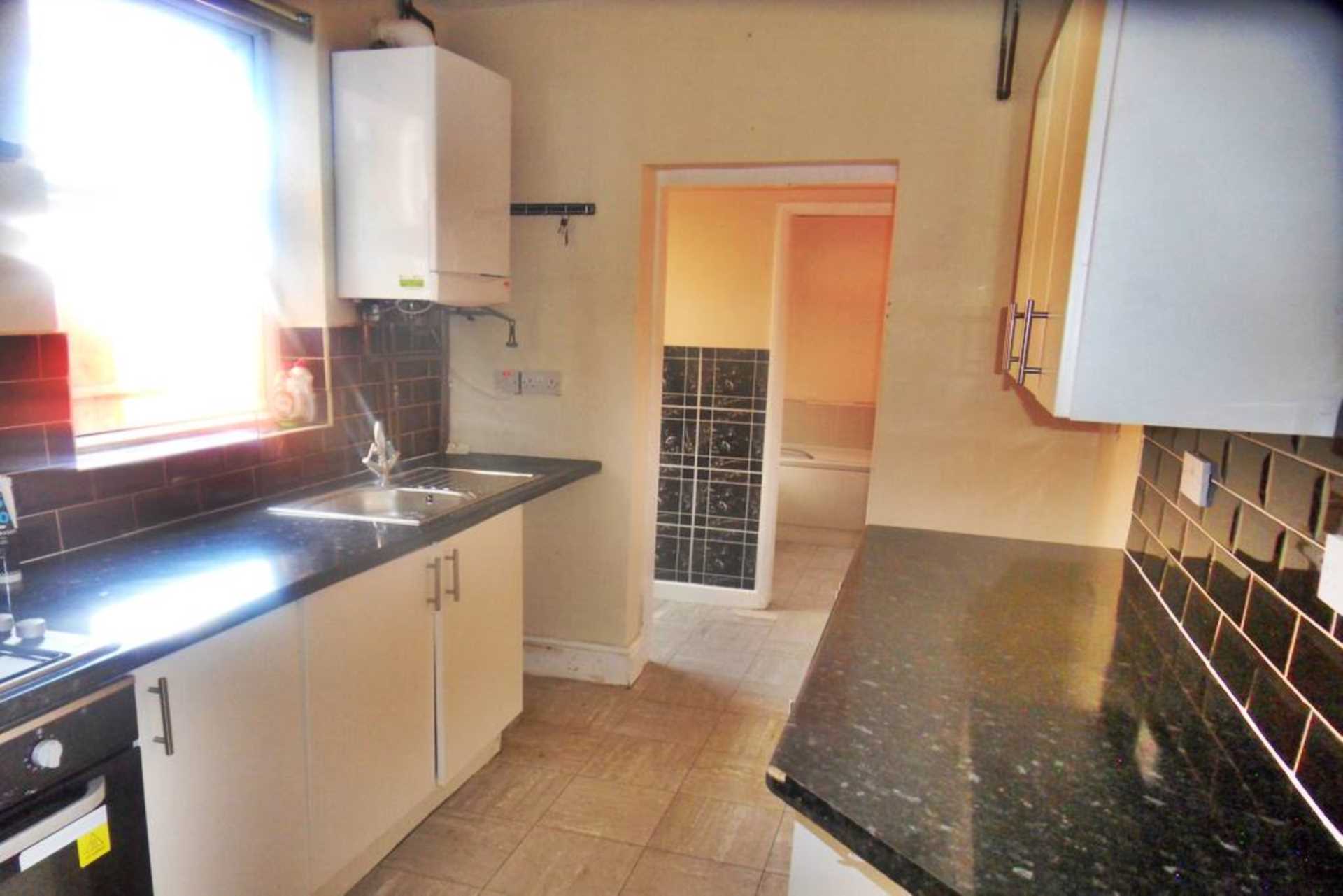 With tiled flooring, matching wall and base units with an integrated stainless steel sink. Complete with integrated cooker with extractor hood over. With splashback tiled walls and double glazed window to the side elevation. With access to the ground floor bathroom.